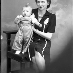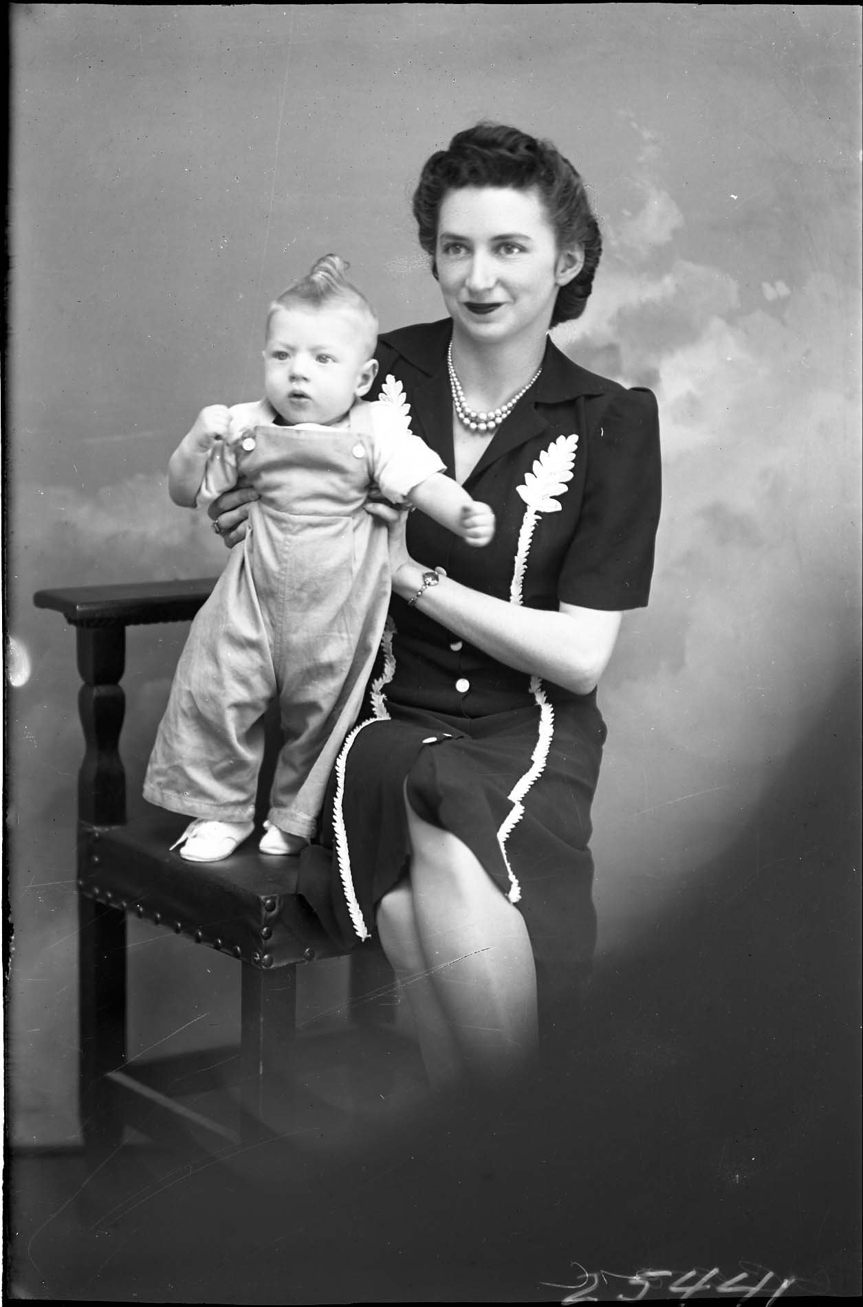 Unidentified woman with short hair and wearing faux pearls, is seated and holding up an unidentified young child beside her.