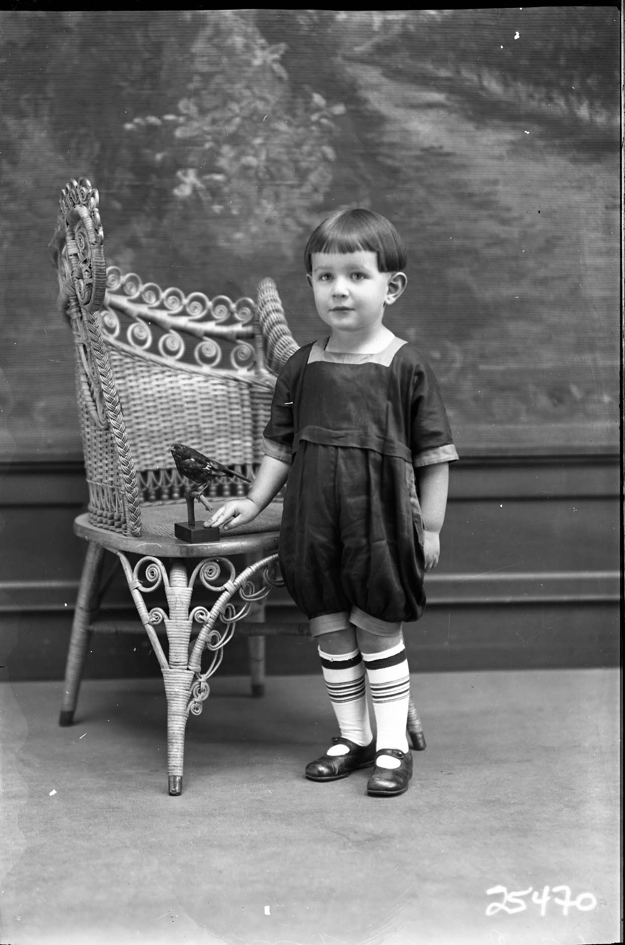 Photograph of Linden Alton Fravel as a young boy standing by a wicker chair and a toy bird.