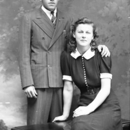 Unidentified man is standing with his arm around the shoulders of an unidentified woman, who is seated.