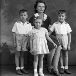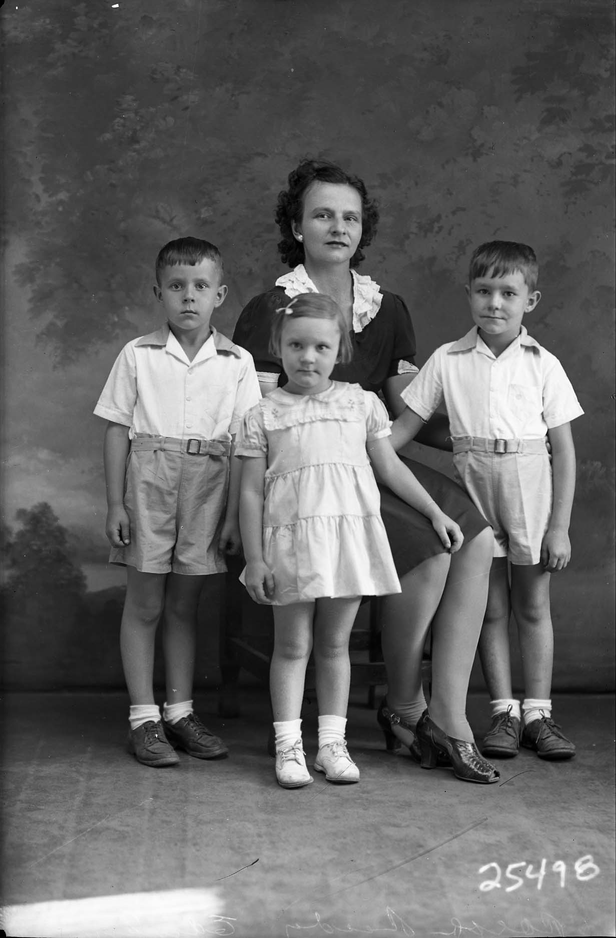 Unidentified woman is seated with three unidentified children. The two boys are wearing matching outfits.
