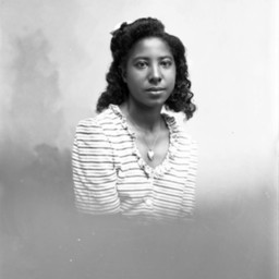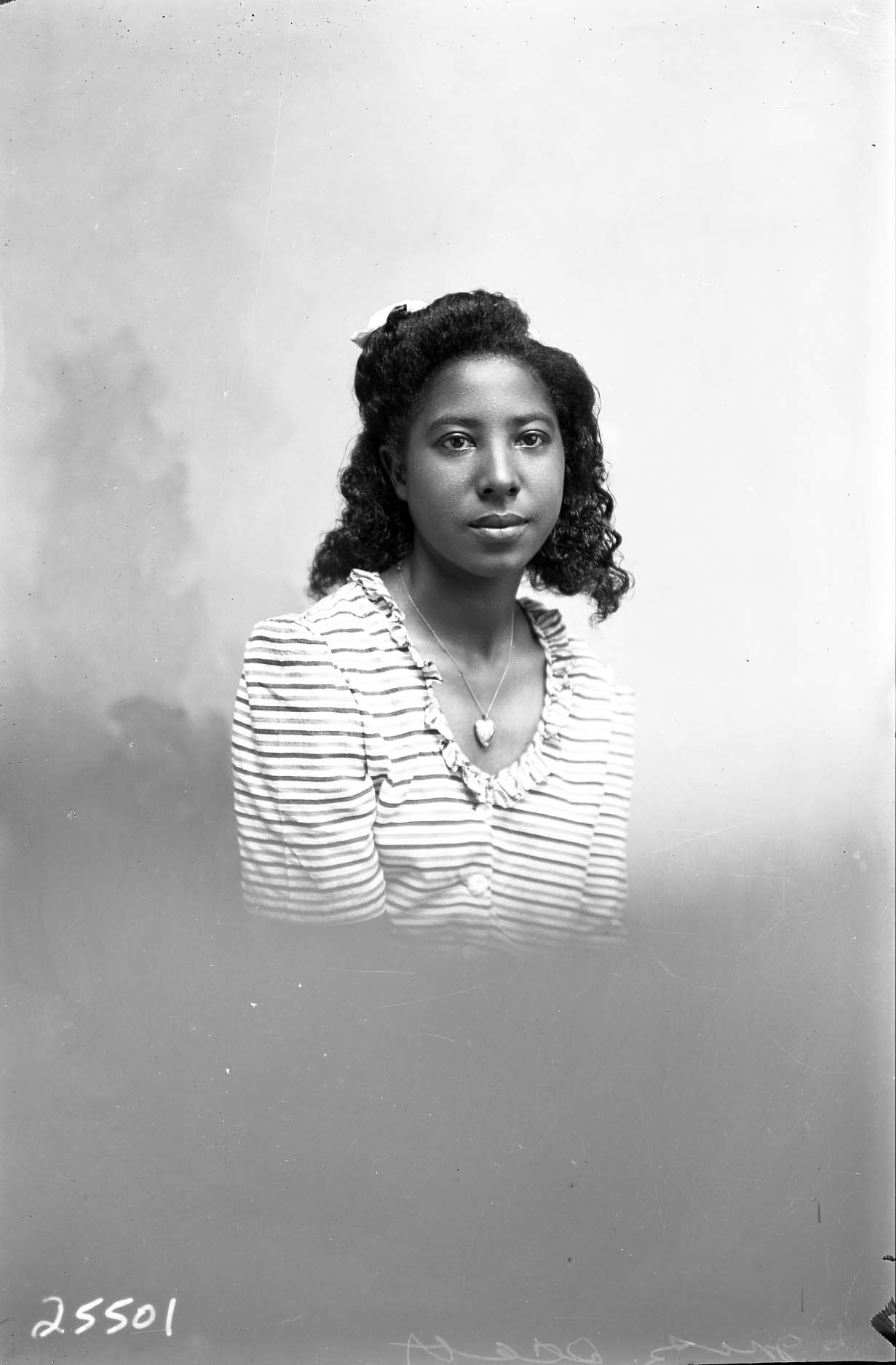 Portrait photograph of an unidentified, young, African American woman wearing a necklace and striped dress.