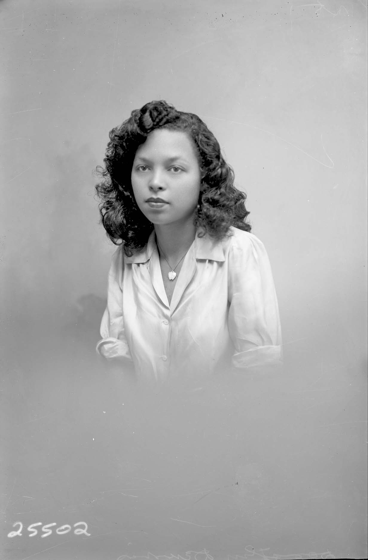 Portrait photograph of an unidentified young African American woman with shoulder-length hair and wearing a necklace.