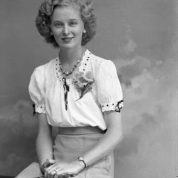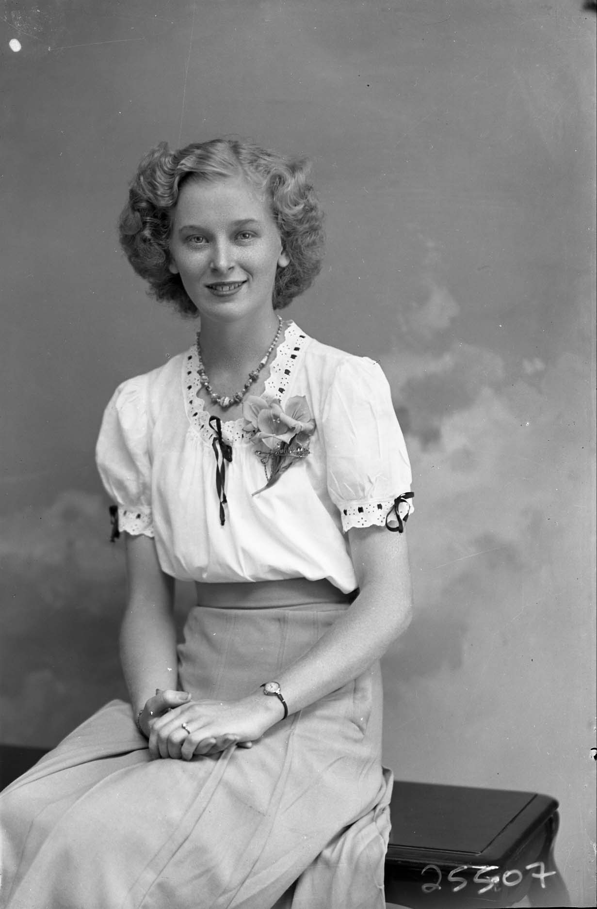 Unidentified young woman with short curly hair is seated on a bench and wearing a corsage on her blouse.