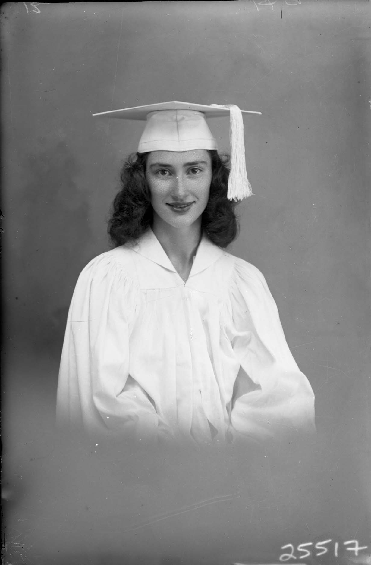 Portrait photograph of Myirl Haun as a young woman wearing her graduation cap and gown.