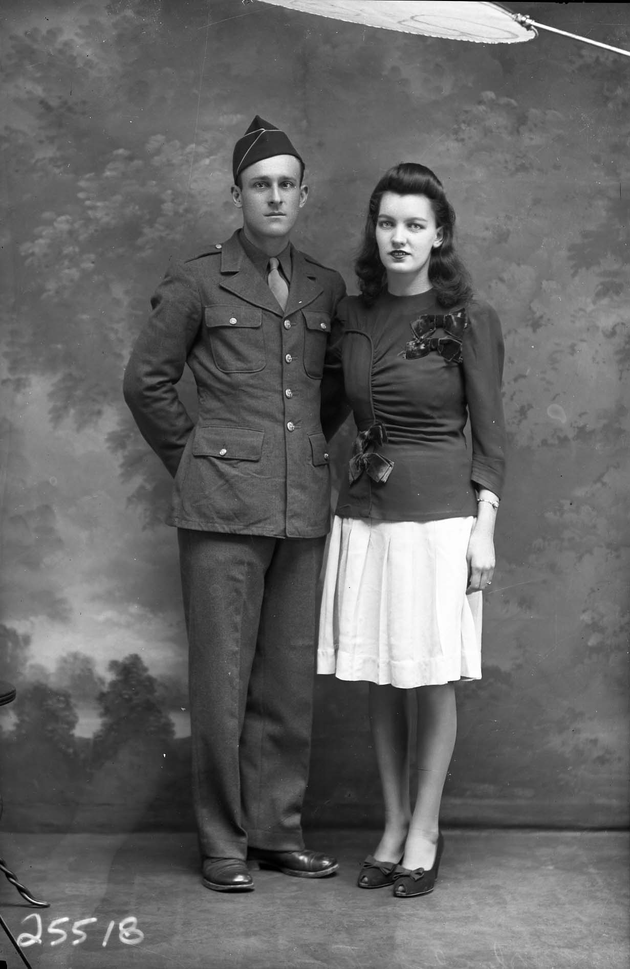 Unidentified man wearing a U.S. Army uniform is standing beside an unidentified woman wearing a corsage.