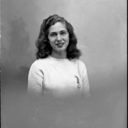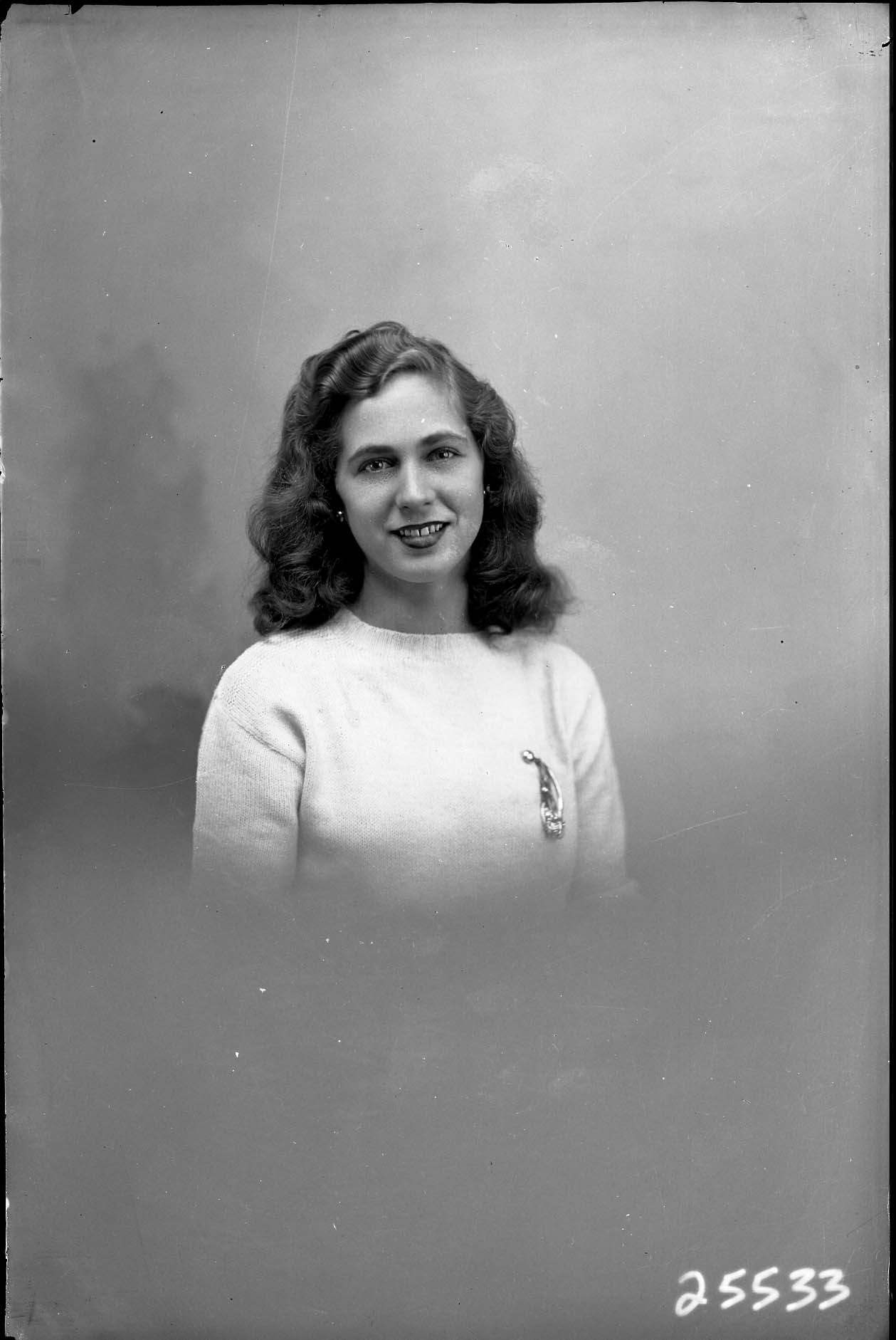 Portrait photograph of an unidentified young woman with shoulder-length, wavy hair. She is wearing a pin on her sweater.
