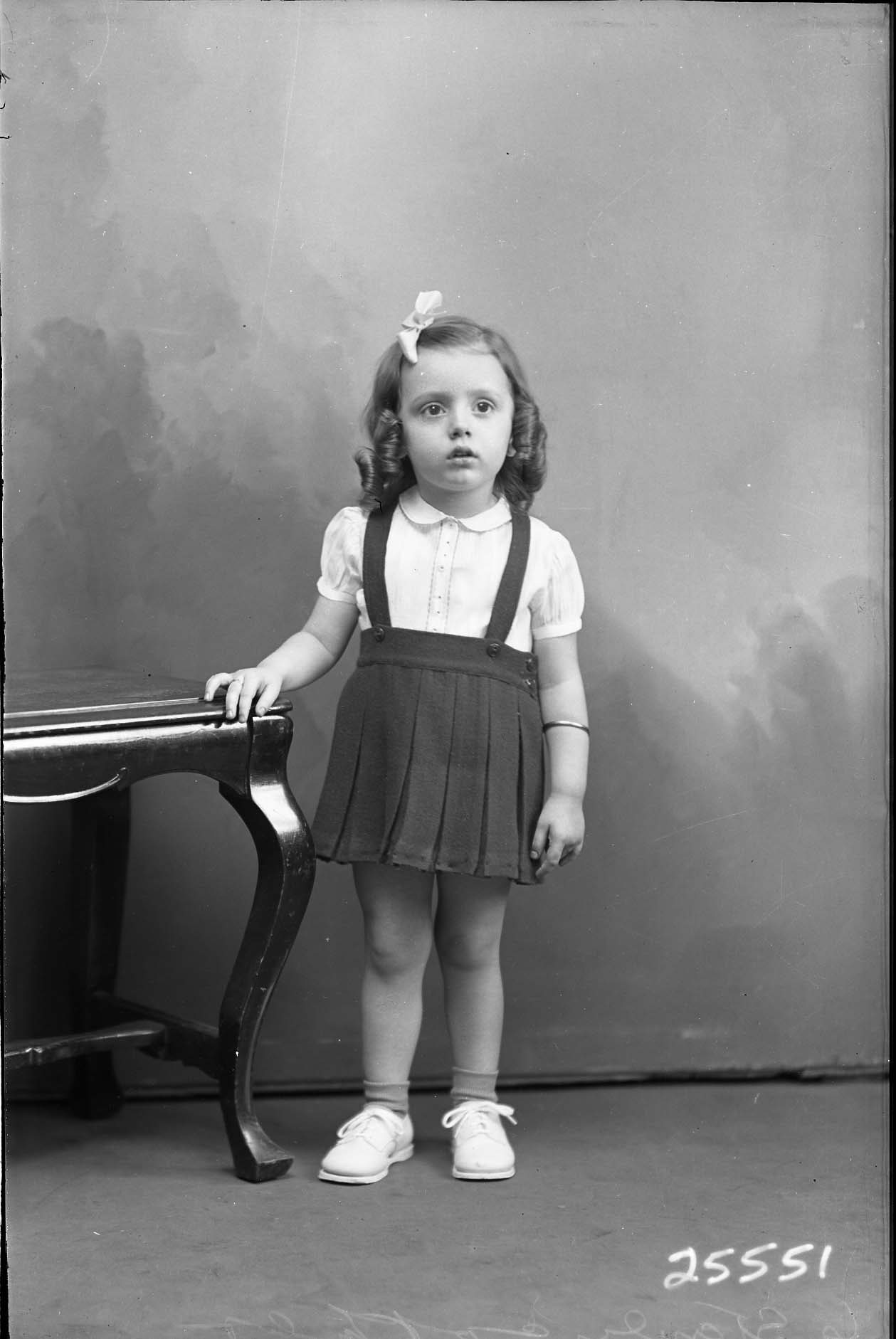 Unidentified young girl with a bow in her curled hair is standing by a bench.