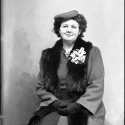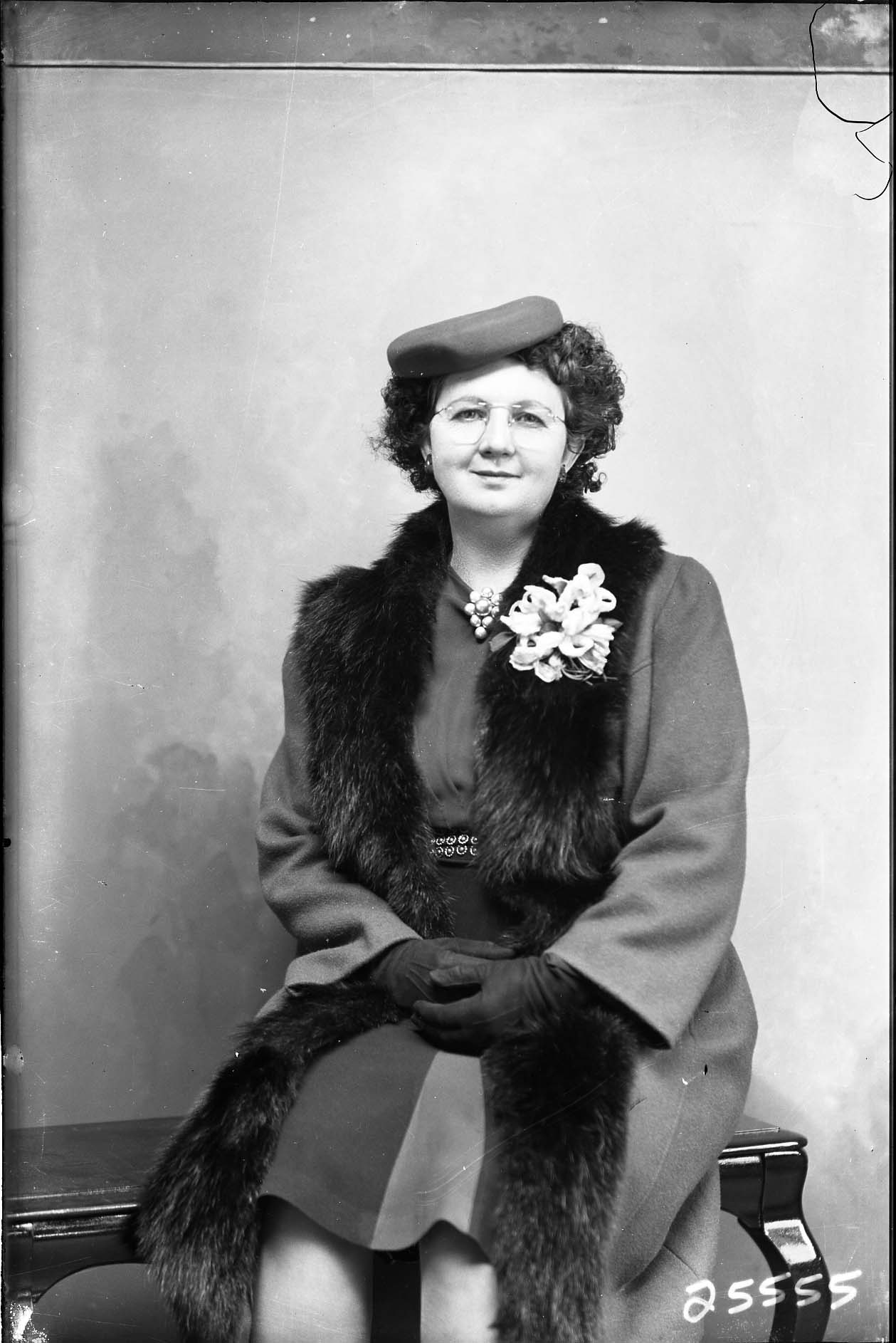 Unidentified woman with glasses is seated on a bench and wearing a hat, gloves, and a corsage pinned to her fur stole.