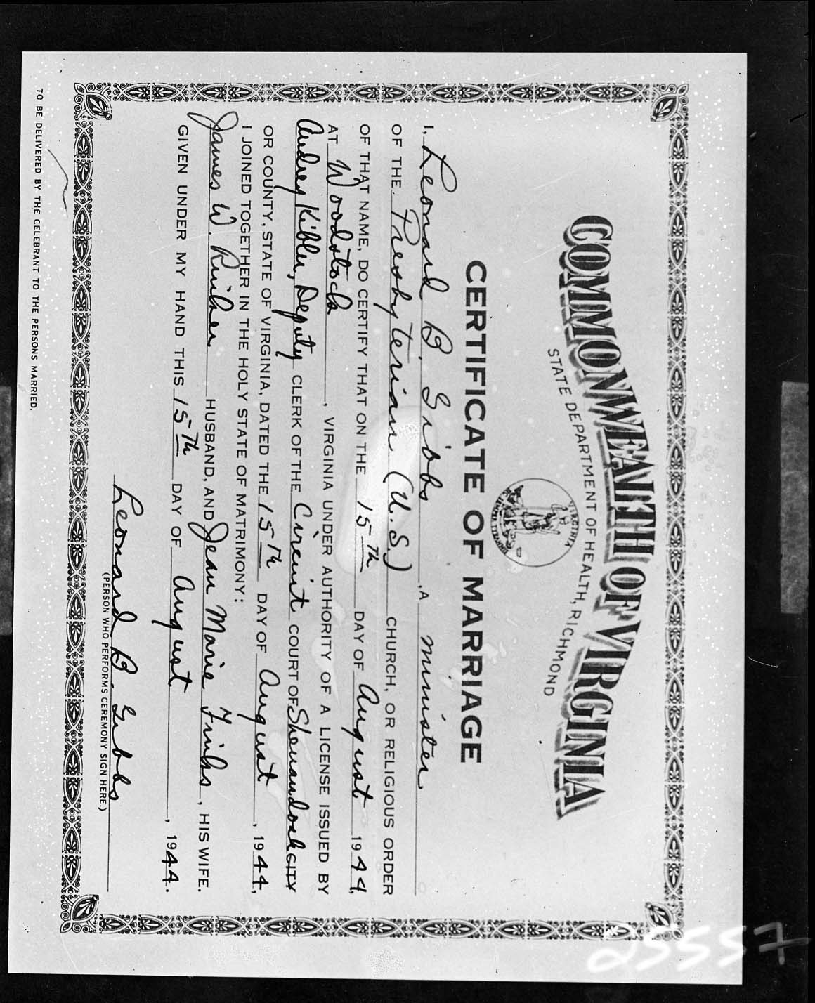 Photograph of the marriage certificate issued for James W. Rinker and Jean Marie (Finks) Rinker, who married on August 15, 1944, in Woodstock.