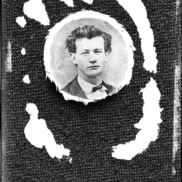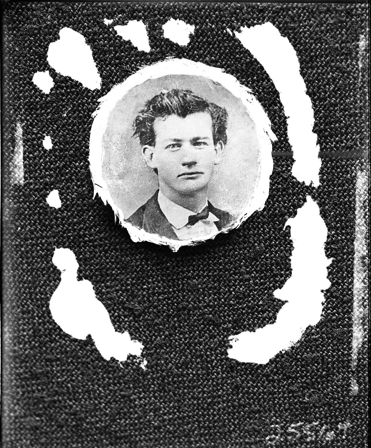 Photo of a round photograph of an unidentified young man wearing a bow tie.