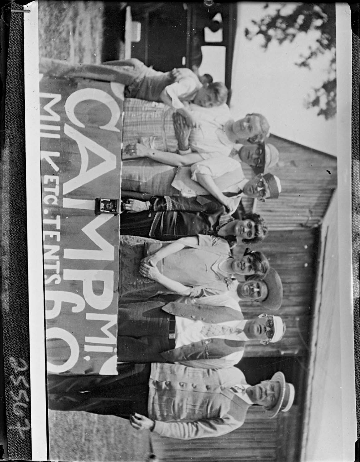 Photo of a photograph of a group of unidentified people (five men, three women and one boy) standing outdoors behind a road sign that says, "Camp 6.0 mi. Milk ETC".