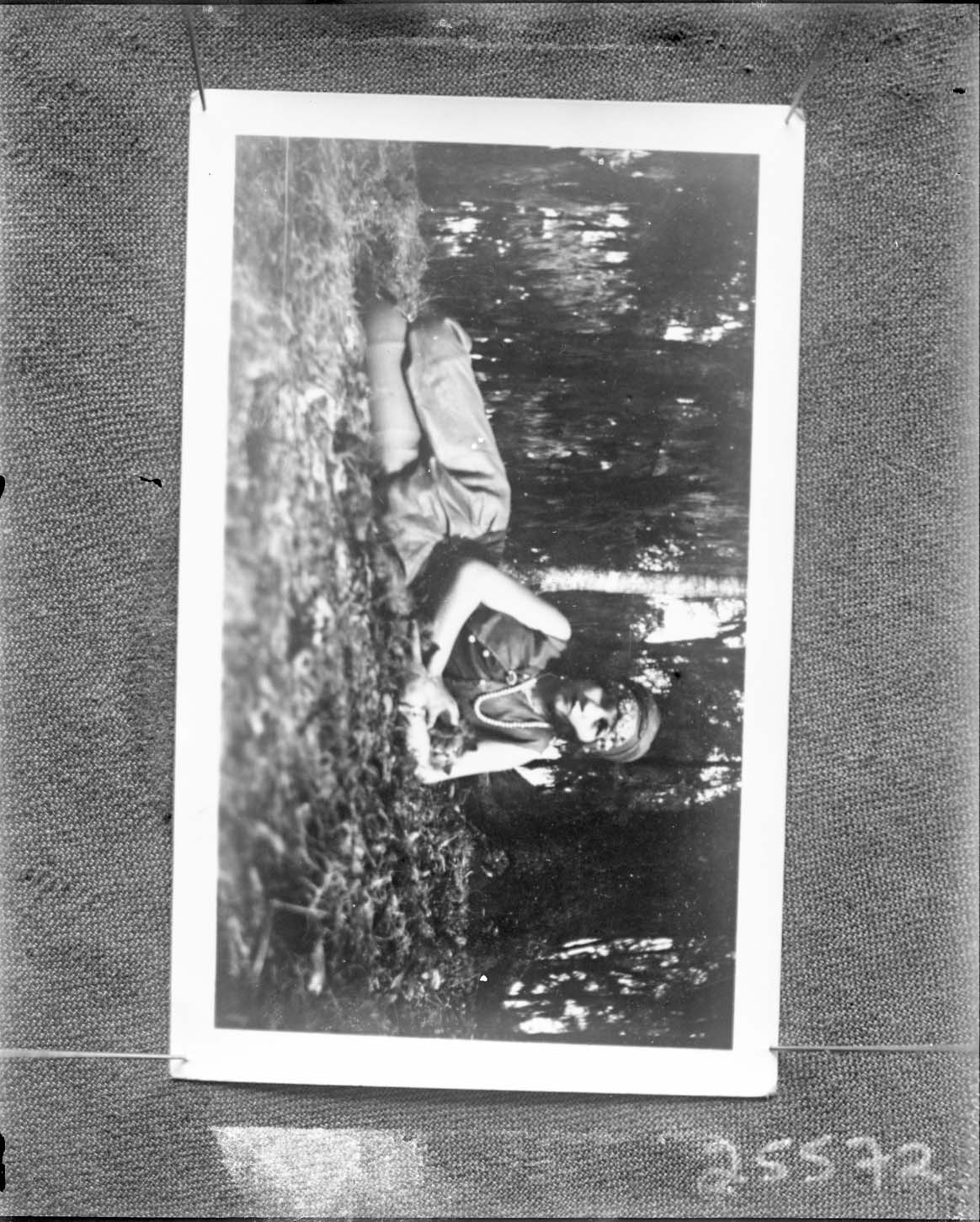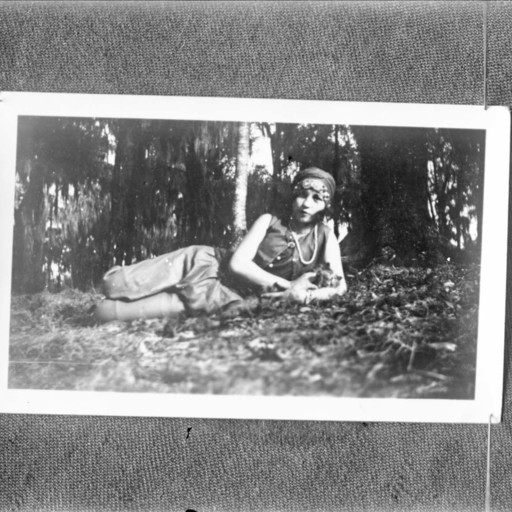 Photo of a photograph of an unidentified woman lying on her side outdoors. Trees and foliage are visible behind her.