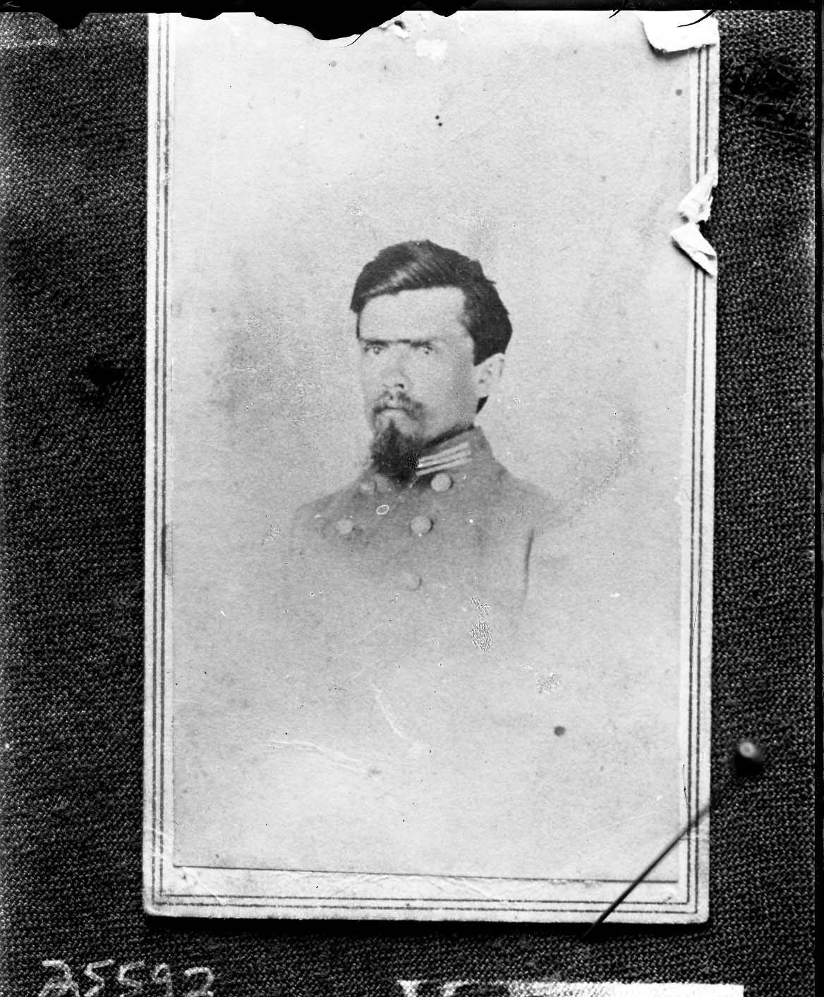 Photo of a postcard photograph of an unidentified man with a beard and mustache in a Confederate military uniform indicating he held the rank of Captain.