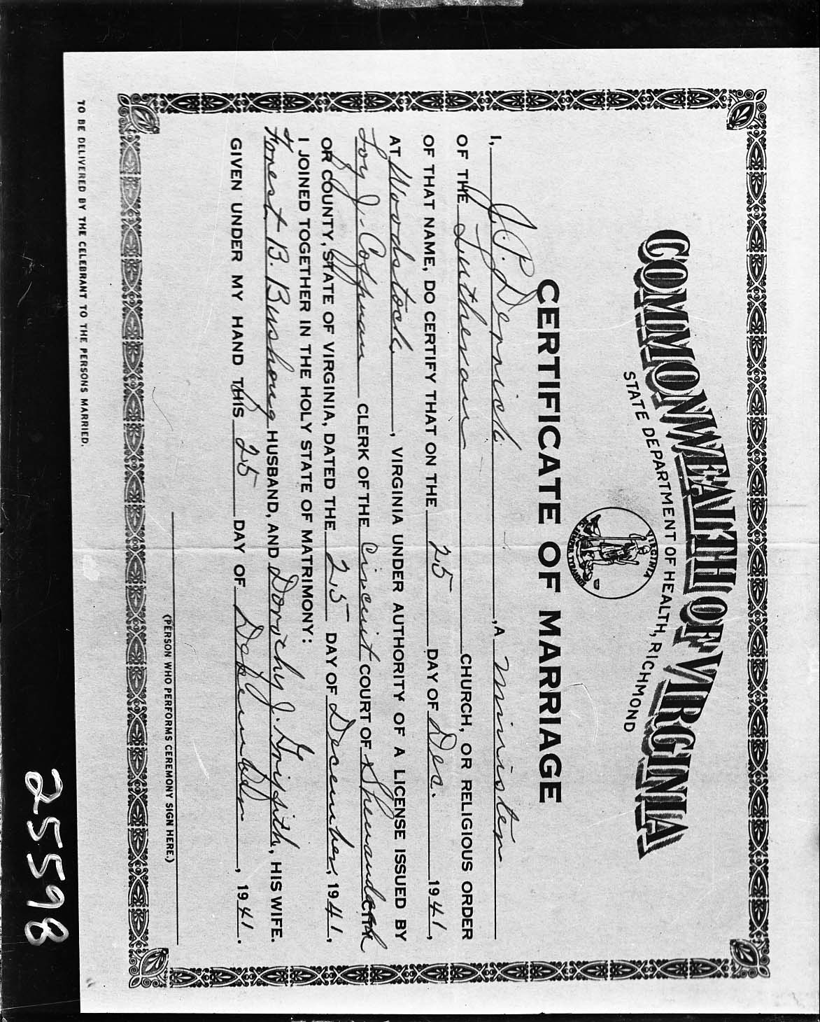 Photograph of the marriage certificate issued to Forest B. Bushong and his wife, D. Jane (Griffith) Bushong when they married in Woodstock on Christmas Day, 1941.