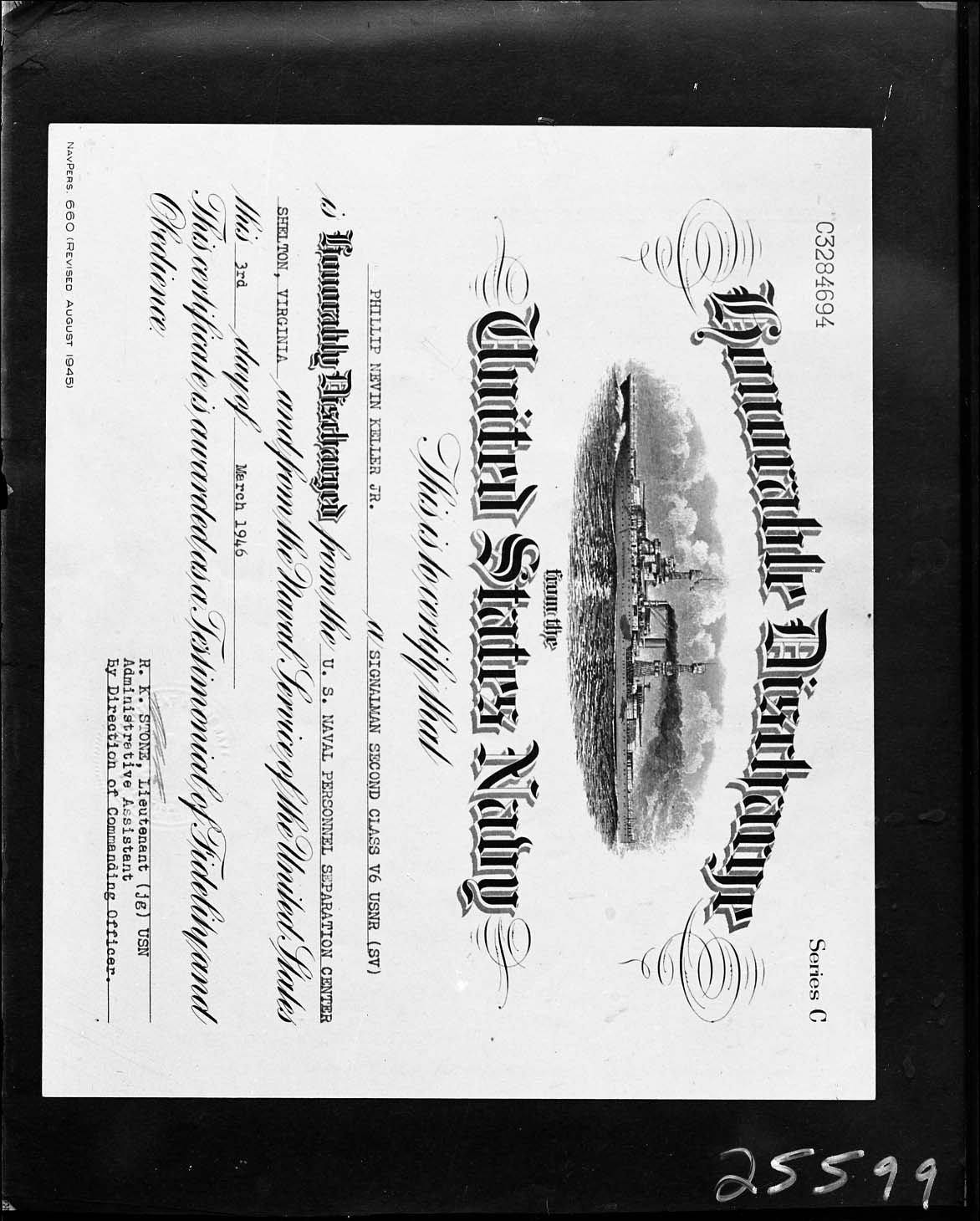 Photograph of the document certifying that Signalman Second Class Phillip N. Keller was honorably discharged from the Navy in Shelton, Virginia, on March 3, 1946.