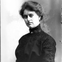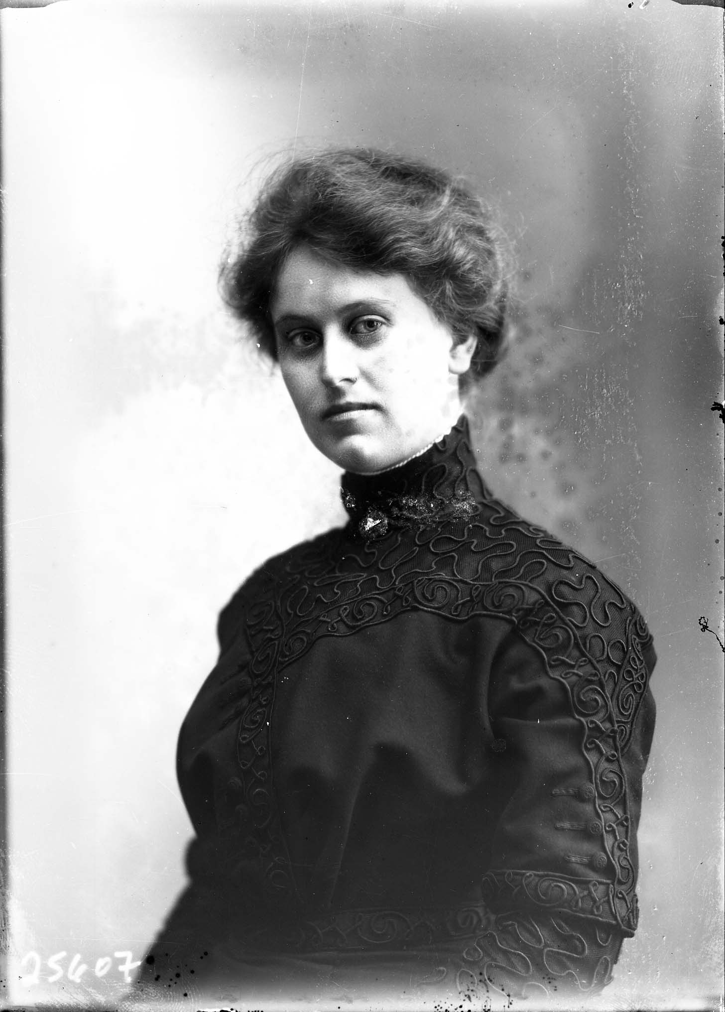 Portrait photograph of an unidentified woman with her hair pulled back and wearing a lon-sleeved dress.