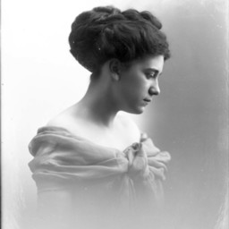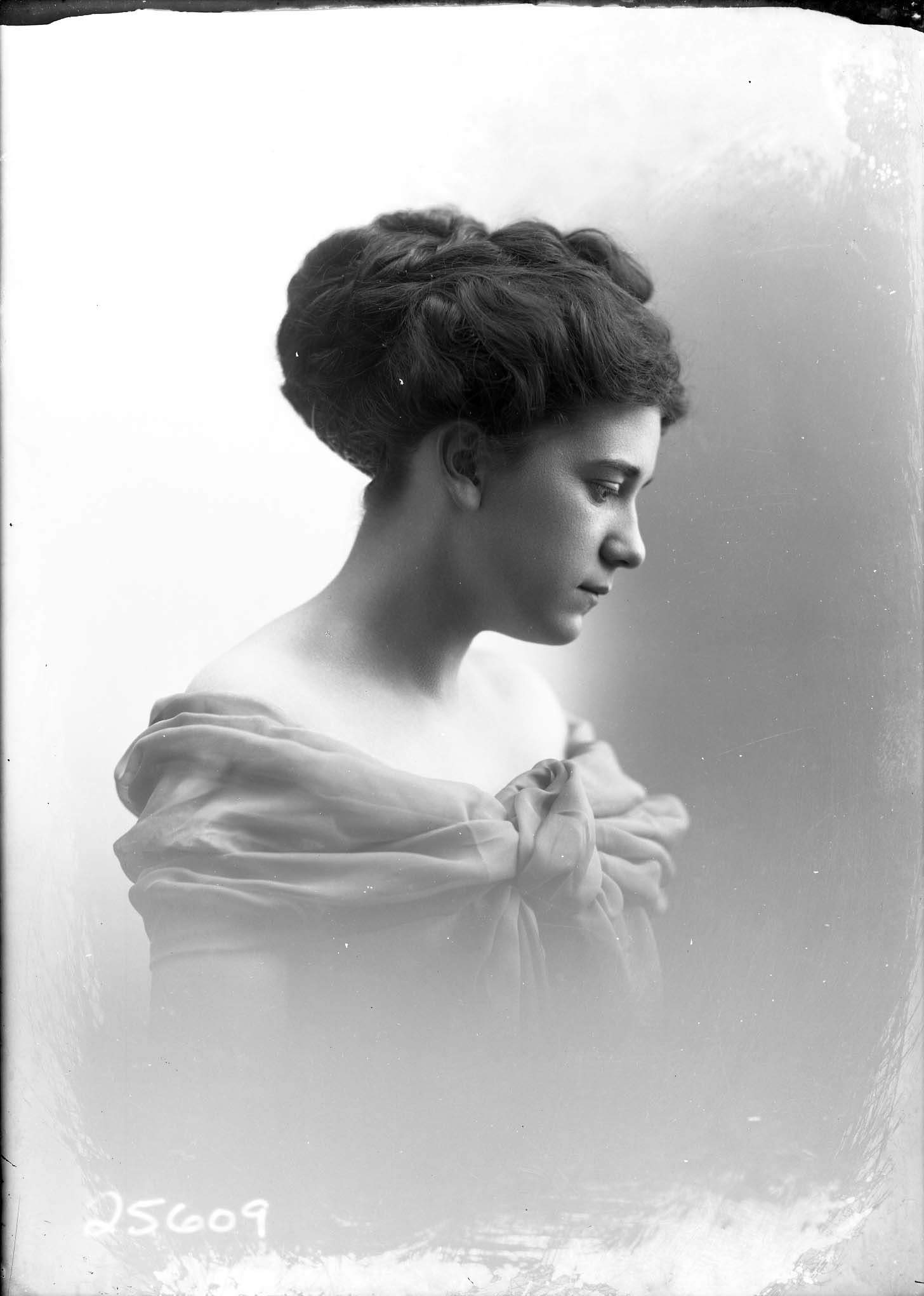Portrait photograph of an unidentified woman with her hair styled back and looking down and to the side, in profile.