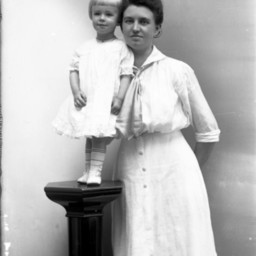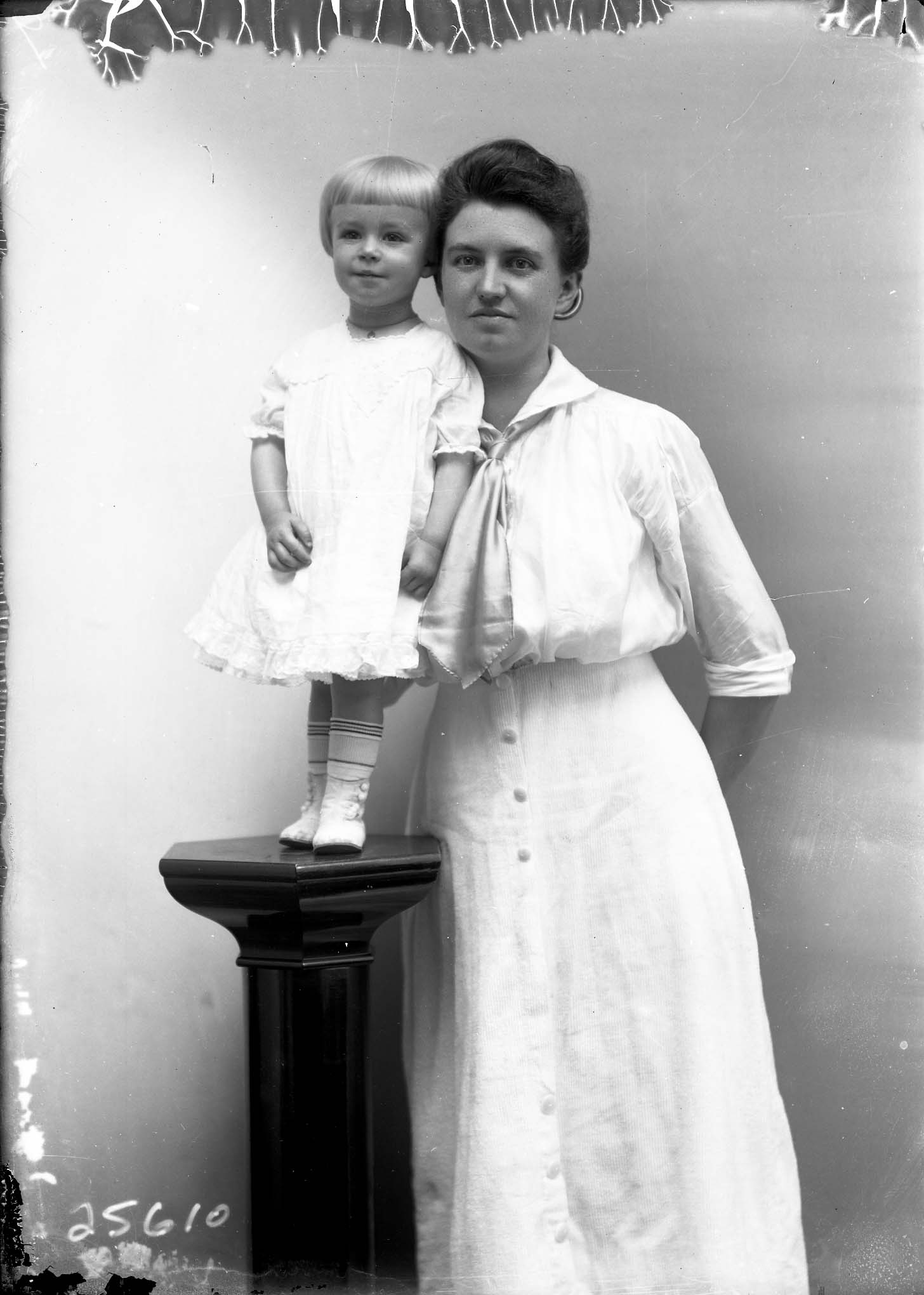 Unidentified woman is posed beside an unidentified young blond girl who is standing on a studio column and leaning against her.