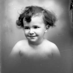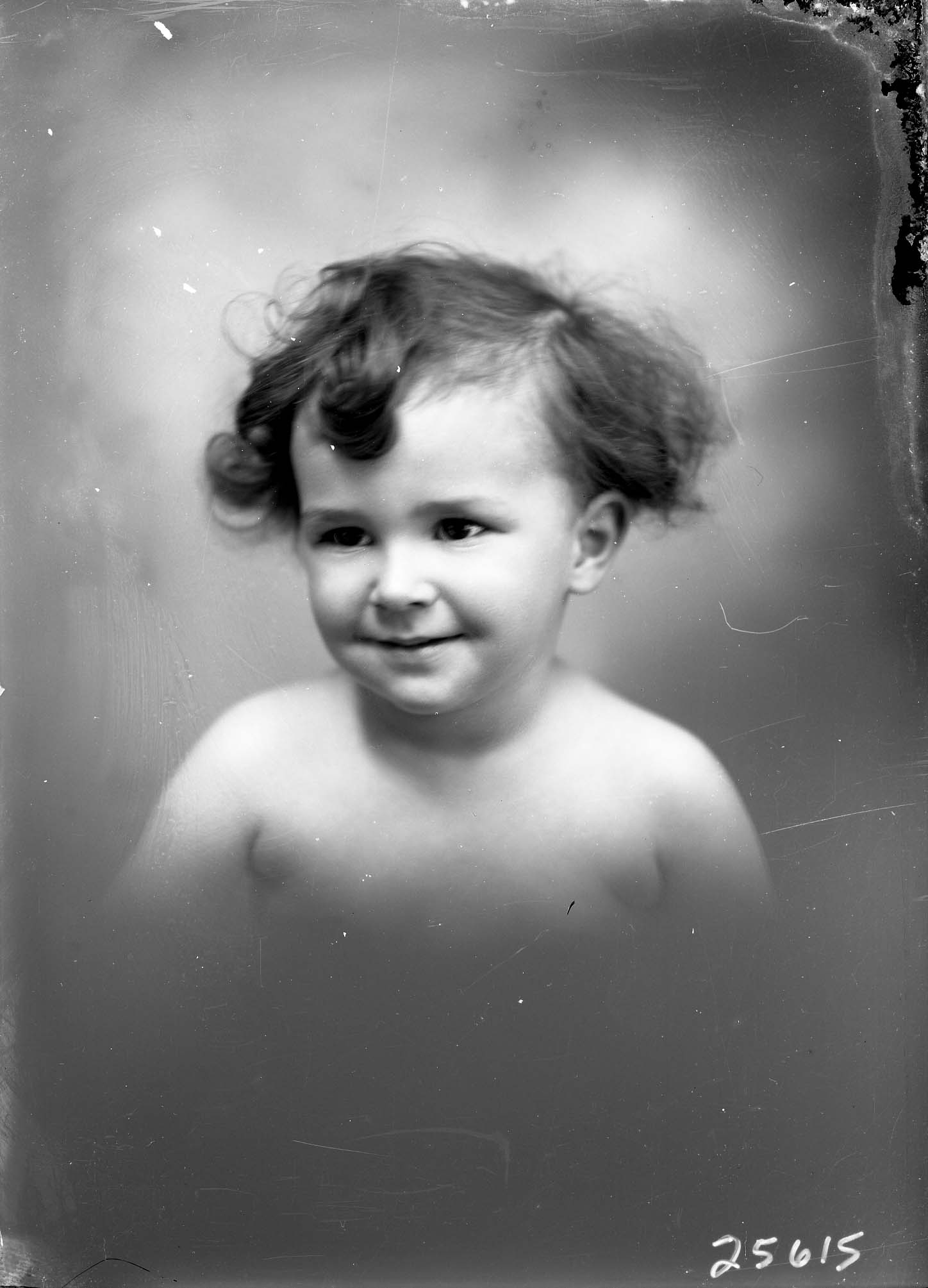 Portrait photograph of an unidentified young child, shirtless, with curly hair.