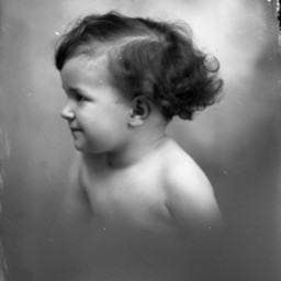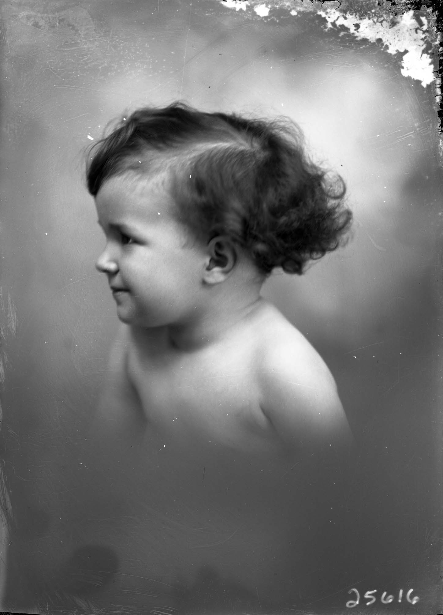 Portrait photograph of an unidentified young child, shirtless, and with curly hair, looking to the side, in profile.