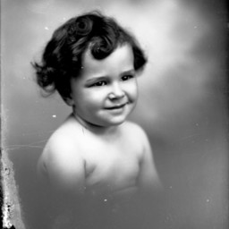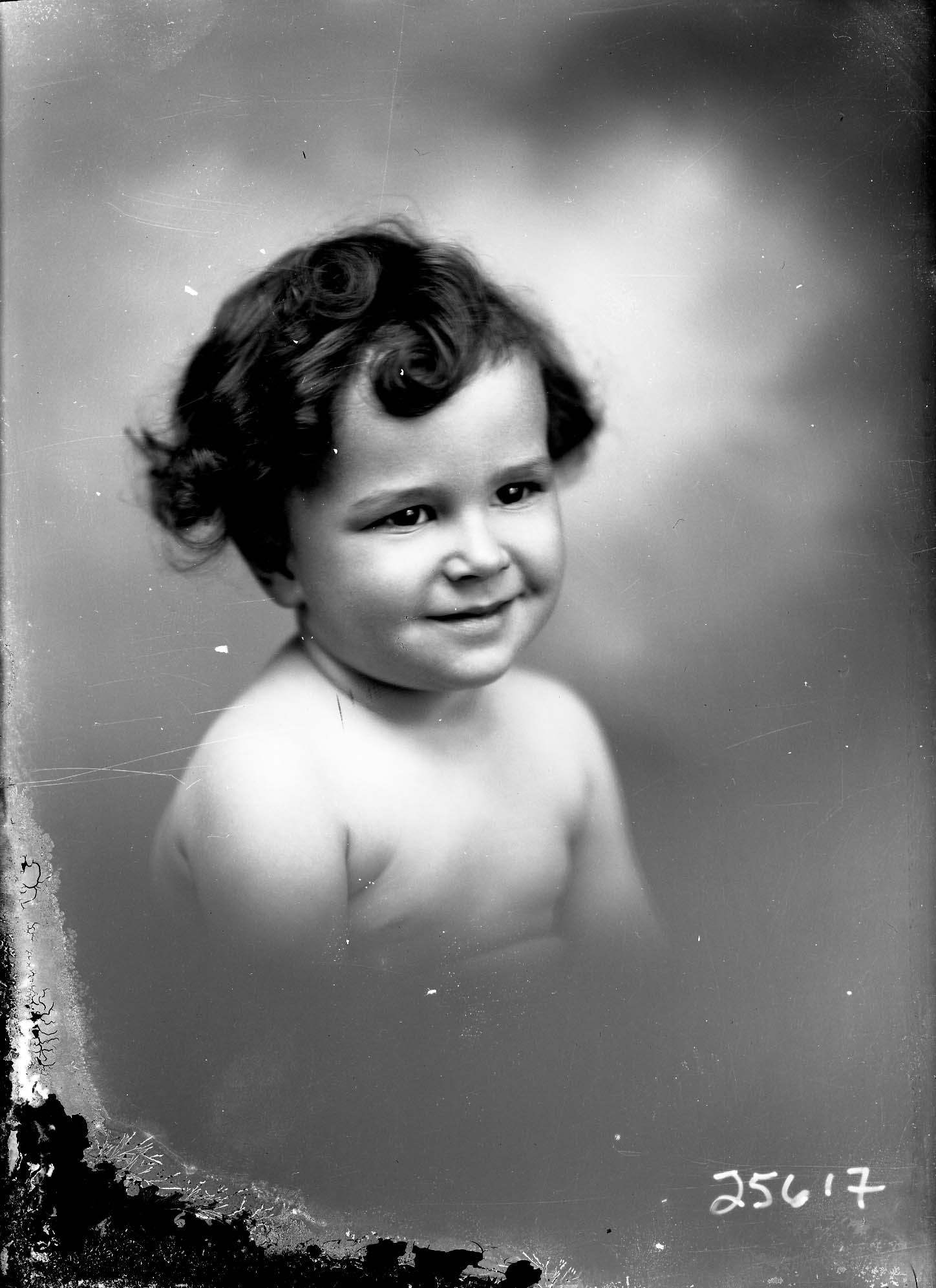 Portrait photograph of an unidentified young child, shirtless, and with curly hair.