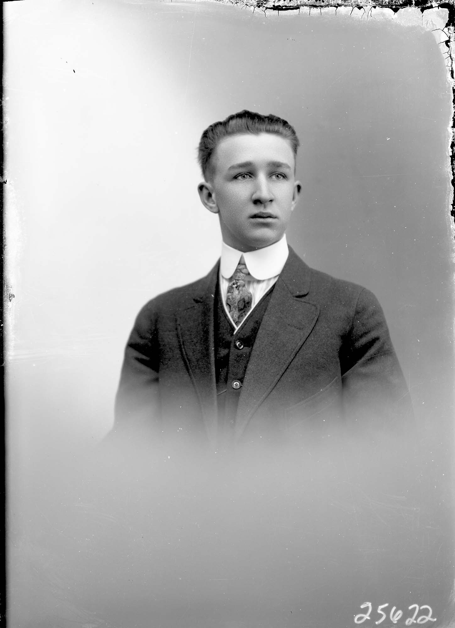 Portrait photograph of an unidentified young man wearing a suit and tie with a starched collar.