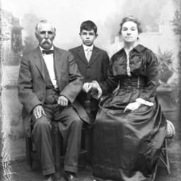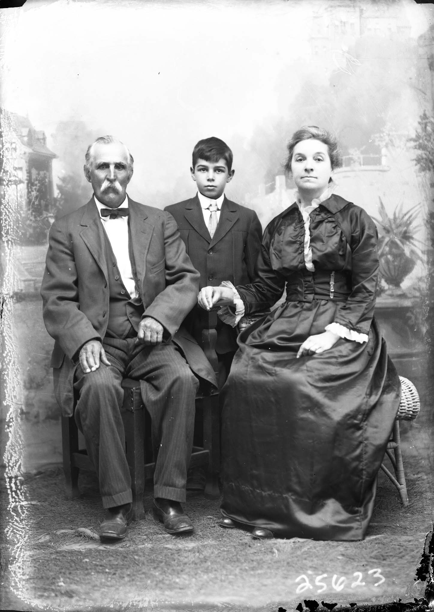 Unidentified man with a mustache is seated beside an unidentified woman. An unidentified boy is standing between them.