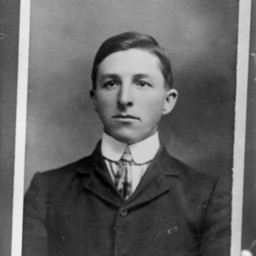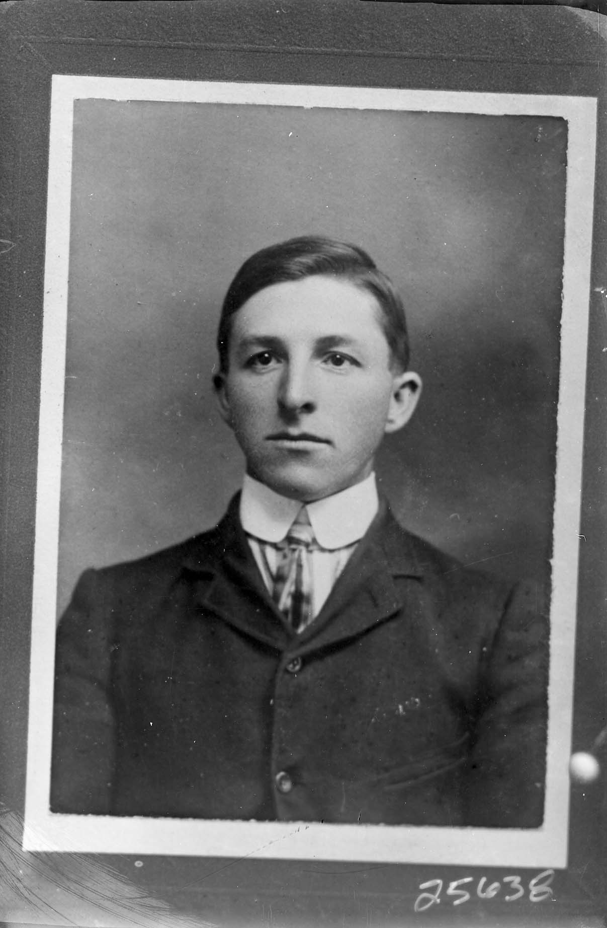 Photo of a portrait photograph of an unidentified young man wearing a suit and tie with a starched collar.