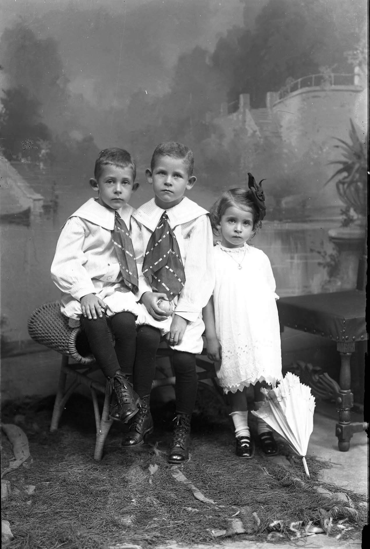 The two boys on the left are wearing matching outfits while the younger girl on the right has a parasol in her hand.