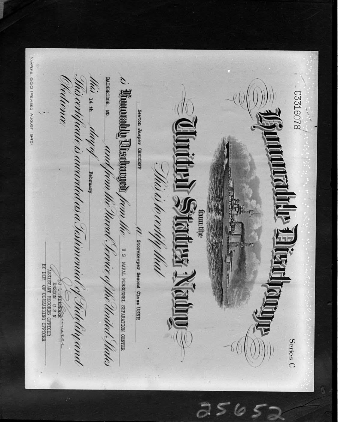 Photograph of the document certifying that Storekeeper Second Class Newton Jasper Orndorff was honorably discharged from the Navy in Bainbridge, Maryland, on February 14th, 1946.