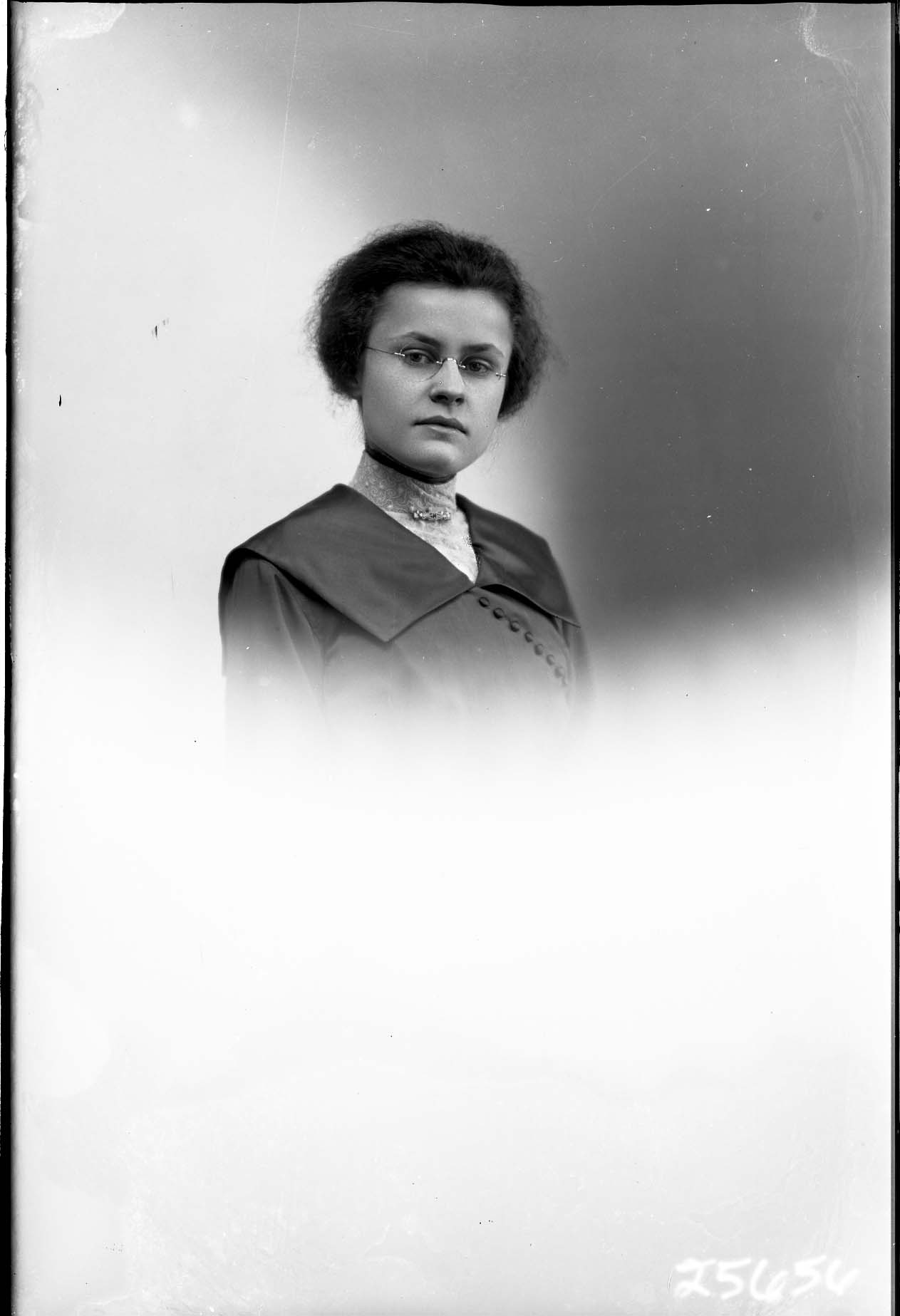 Portrait photograph of an unidentified young woman with her hair pulled back and wearing glasses and a pin at her throat.
