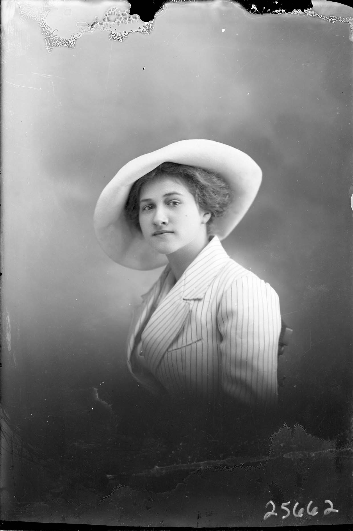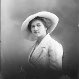 Portrait photograph of an unidentified woman in a wide-brimmed hat and striped jacket.