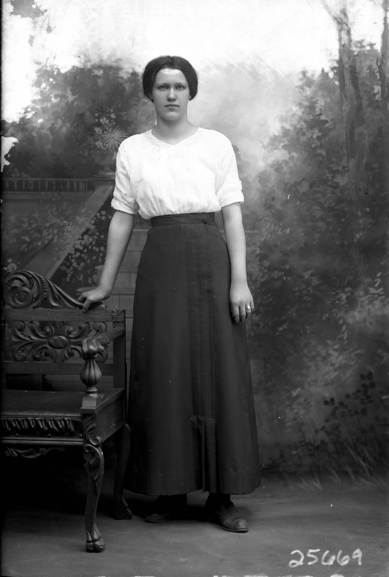 Unidentified young woman with her hair pulled back is standing by a bench and wearing a long skirt and blouse.
