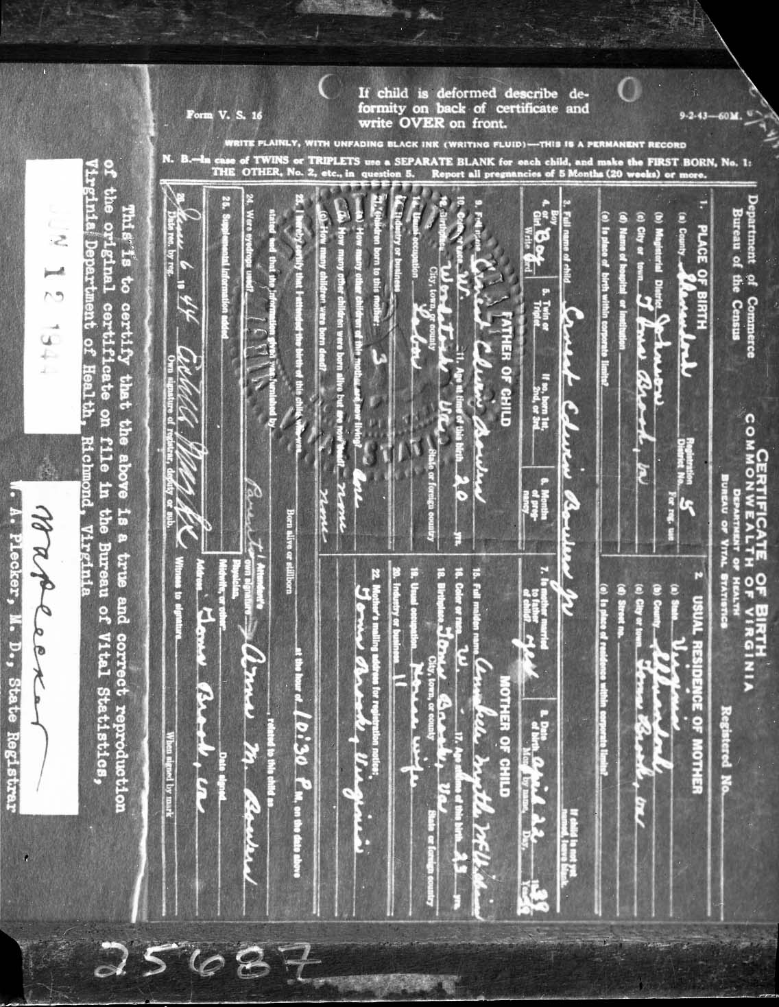 Photograph of the birth certificate issued for Earnest Edmond Bowers, Jr., who was born on April 22, 1939, in Toms Brook, Virginia.