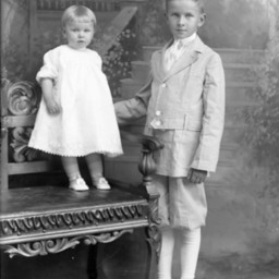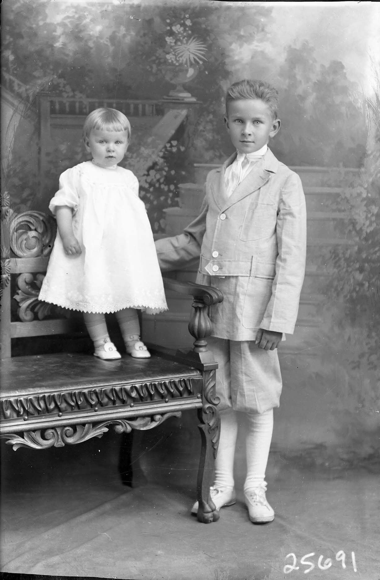 Two unidentified children, a young blond child with short hair and bangs, and an older boy in a suit with short pants.