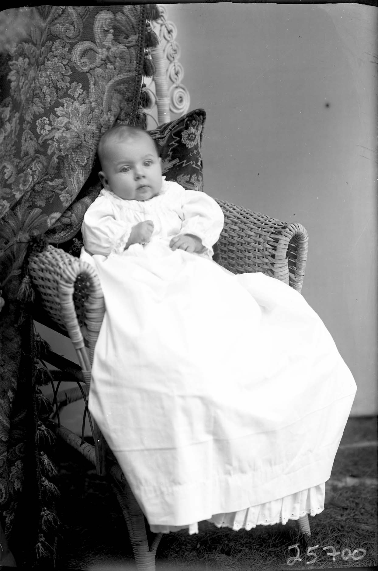 Unidentified baby in a long, white gown, is posed on a wicker chair.