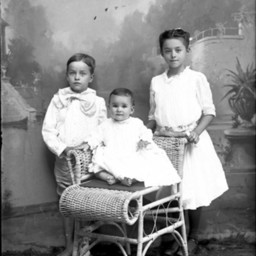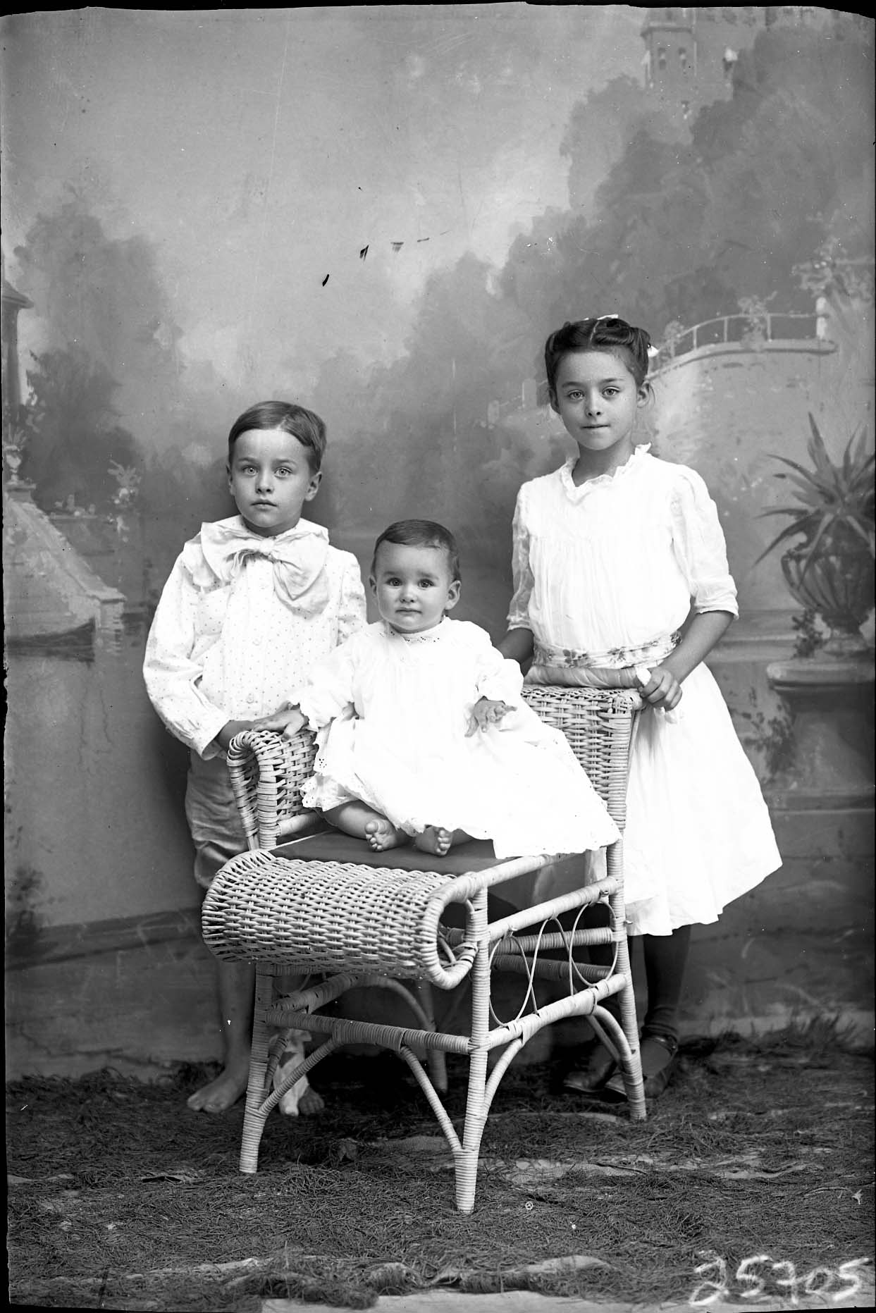 Three unidentified children of varying ages are posed together with a wicker chair.