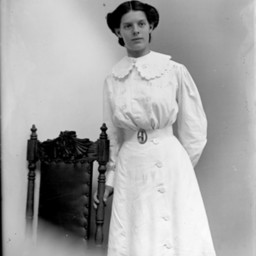 Unidentified woman standing by a chair and wearing a belt with her long dress.