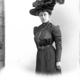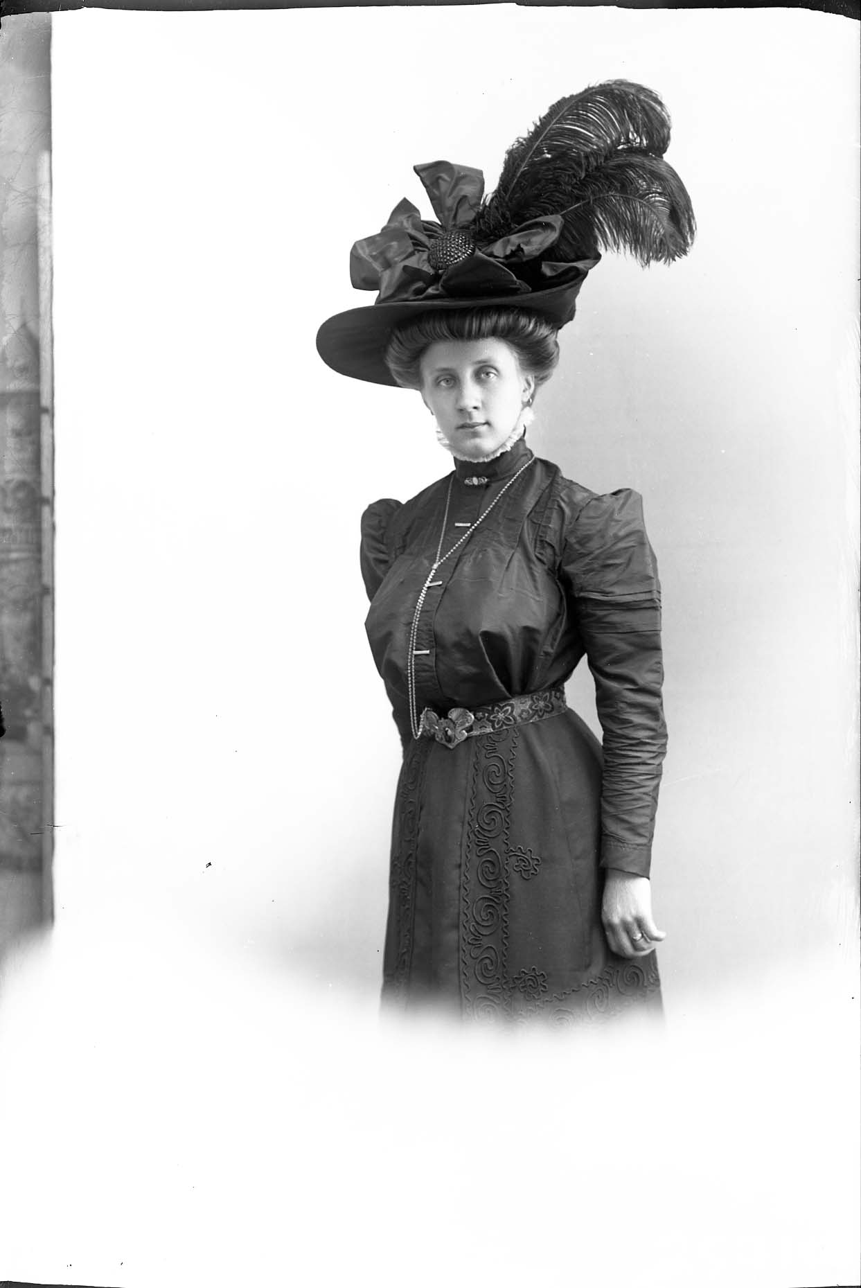 Unidentified woman in a large hat, decorated with feathers and bows, is standing with her hands at her sides.