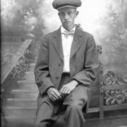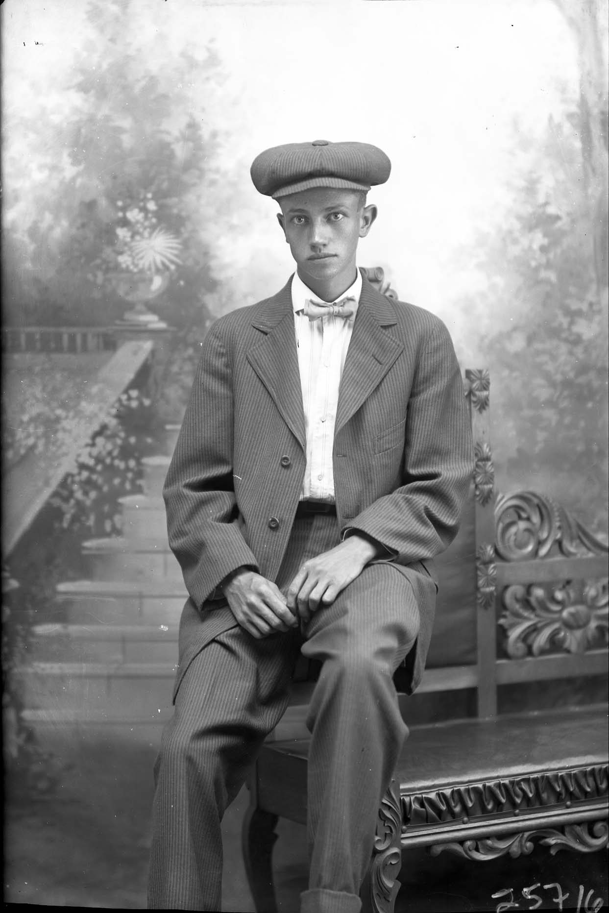 Unidentified young man, probably teen-aged, is seated on the arm of a bench and wearing a bow tie and striped suit with matching cap.