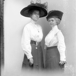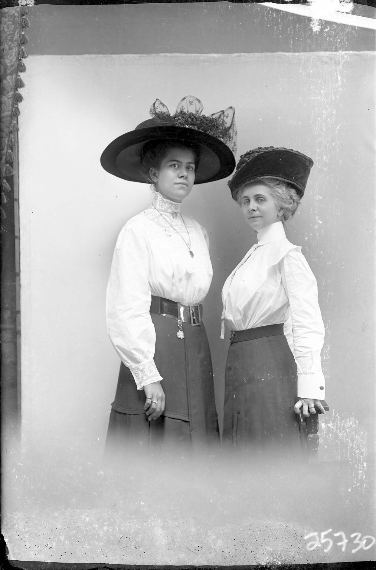 Two unidentified women standing together, both wearing large hats, blouses, and skirts.
