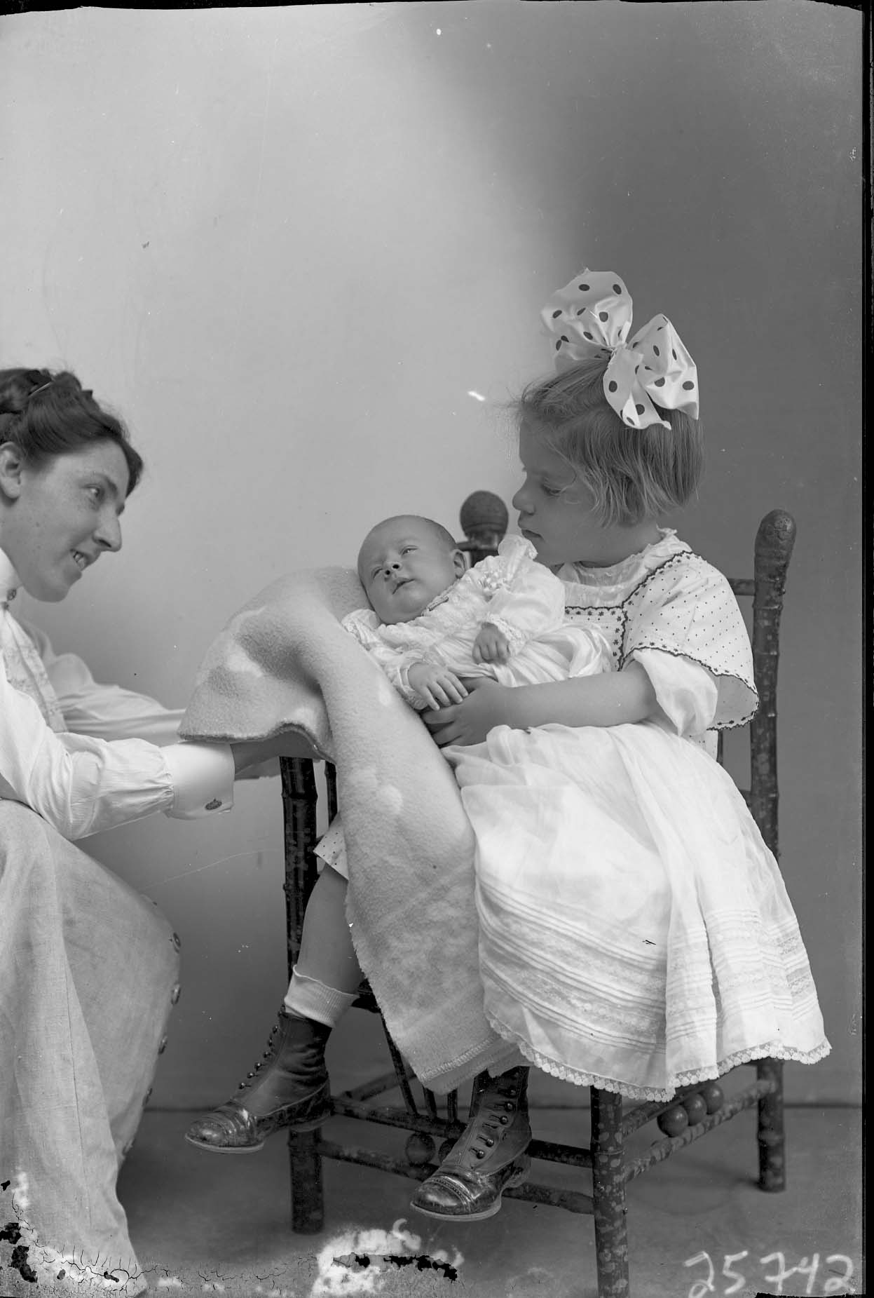 Unidentified young girl with a bow in her hair is seated and holding an unidentified baby in her arms.