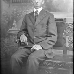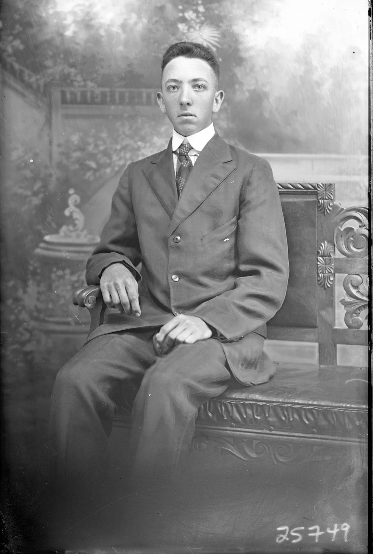 Unidentified young man is seated on a bench and wearing a suit and tie with a starched collar.