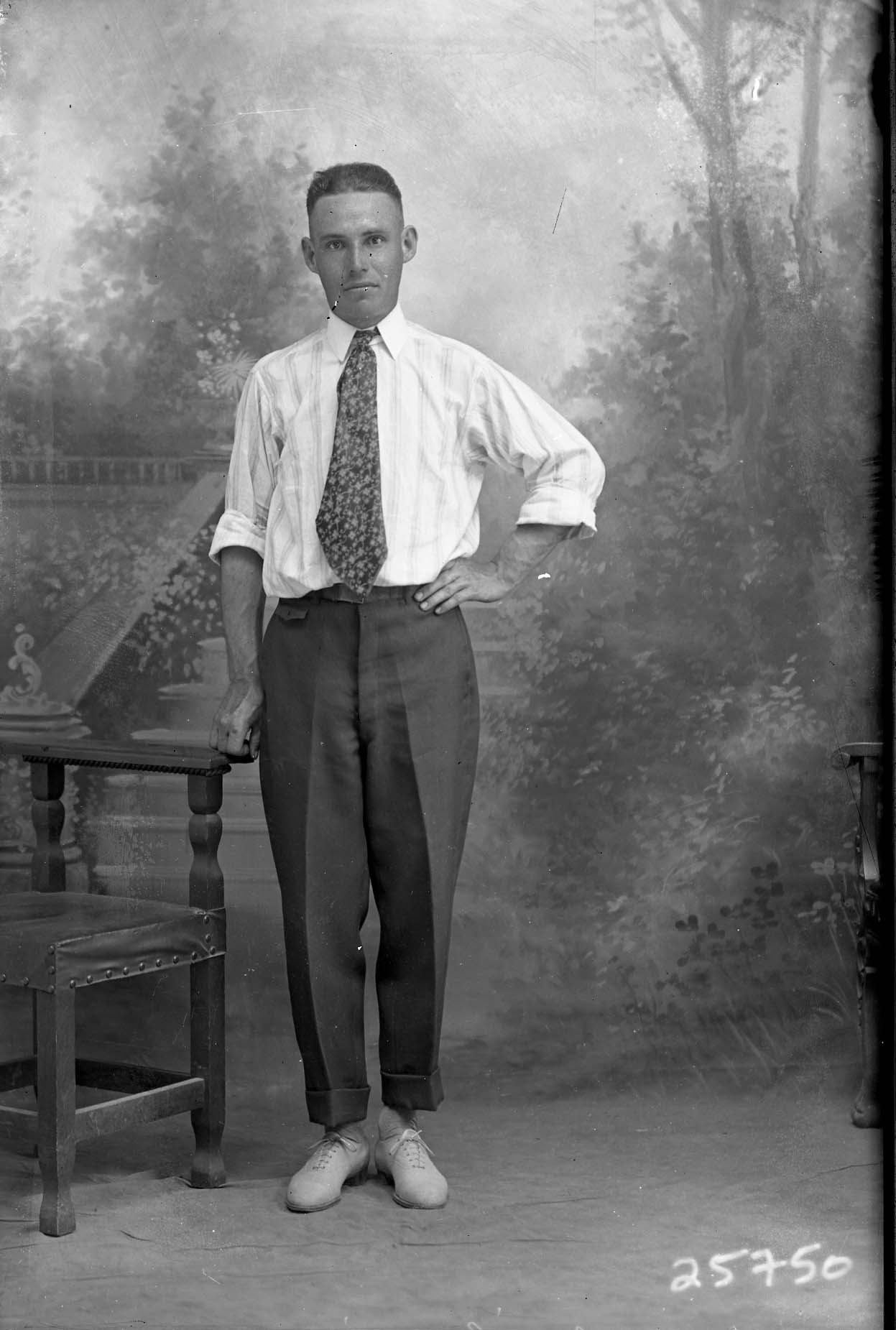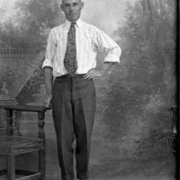 Unidentified man in rolled-up shirt sleeves and a tie, is standing by a chair.