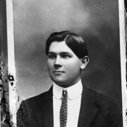 Photo of a portrait photograph of an unidentified young man wearing a suit and thin tie with a starched collar.