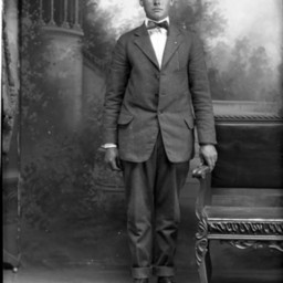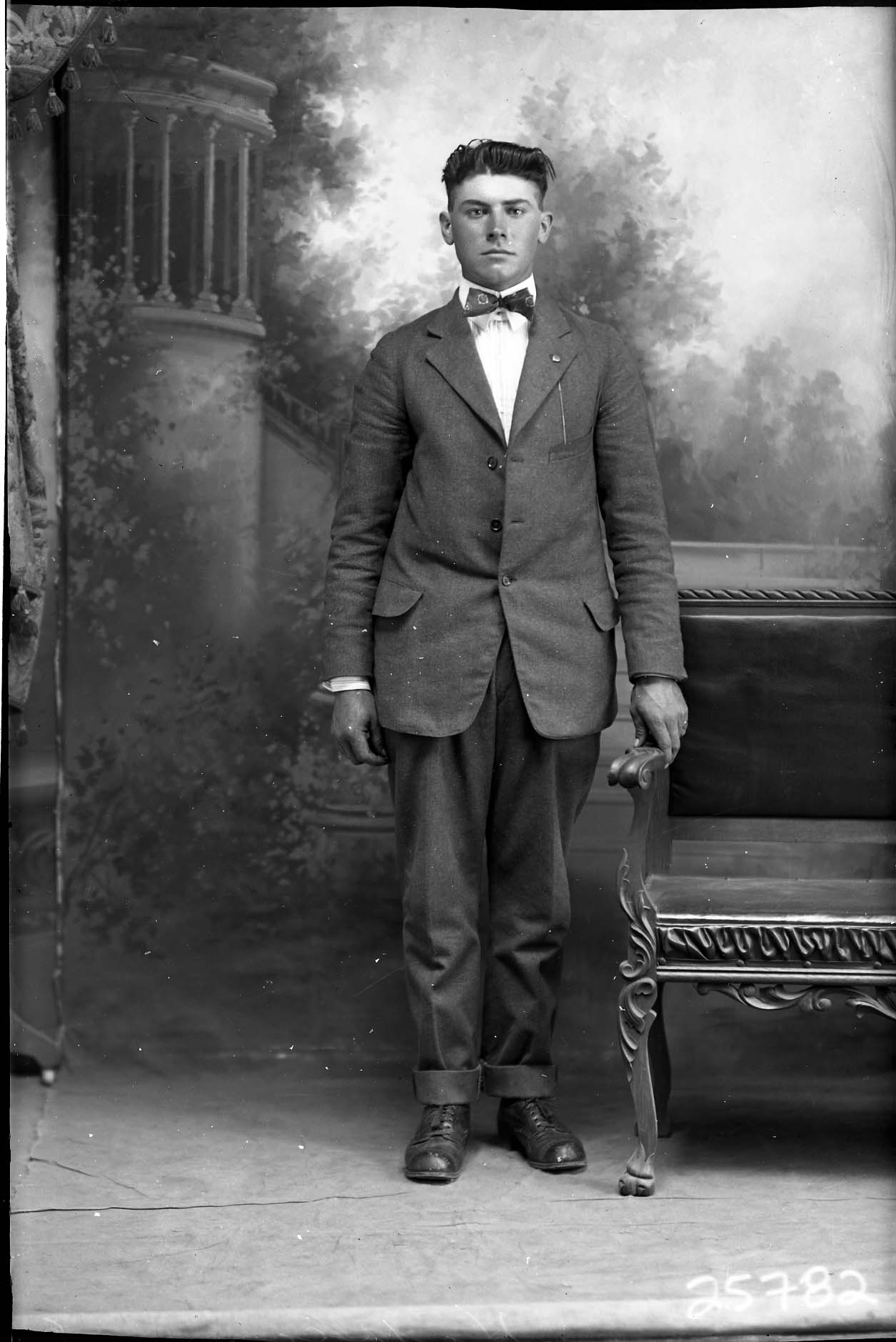 Unidentified young man in a suit and bow tie is standing by a chair.
