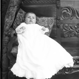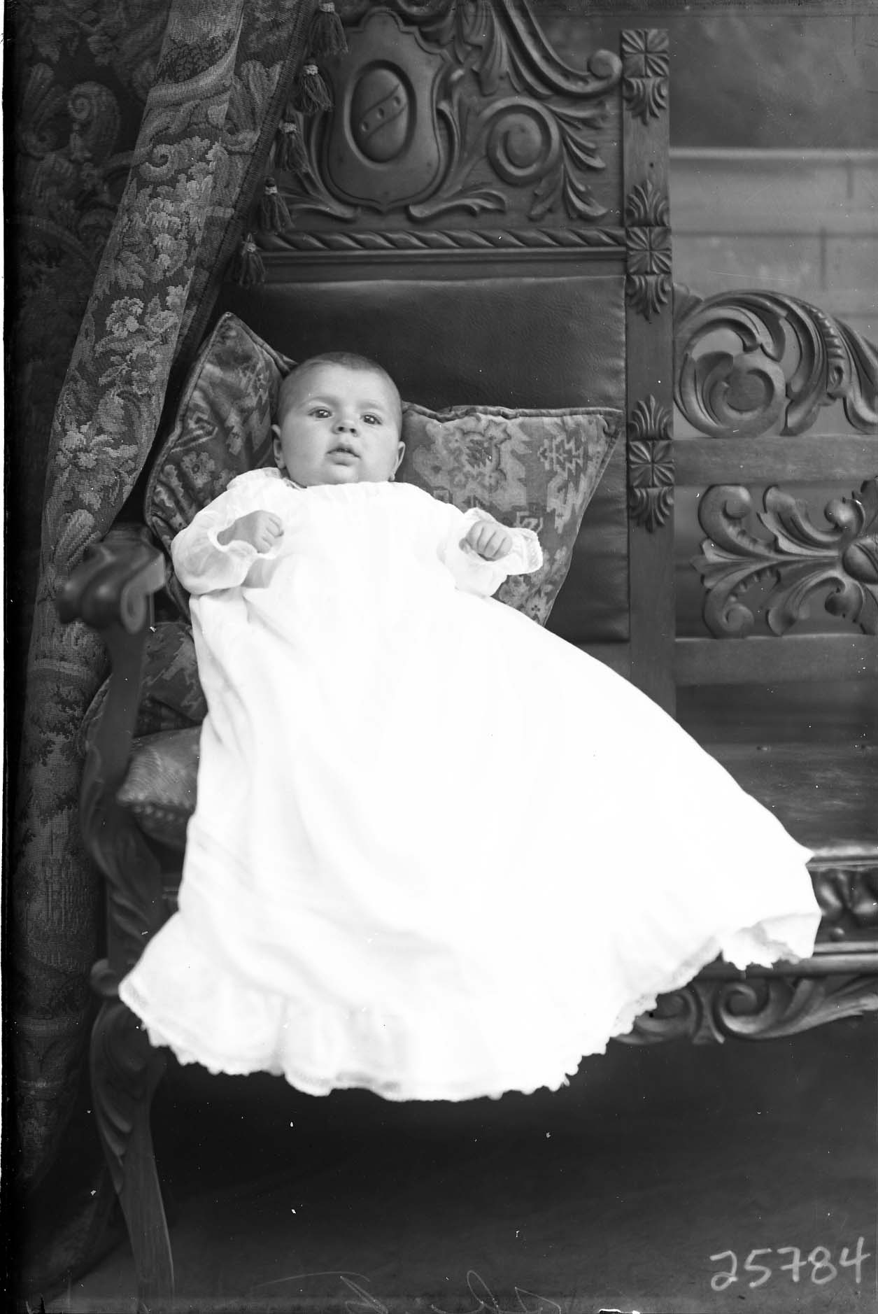 Unidentified baby in a long white gown is propped against pillows on a bench.