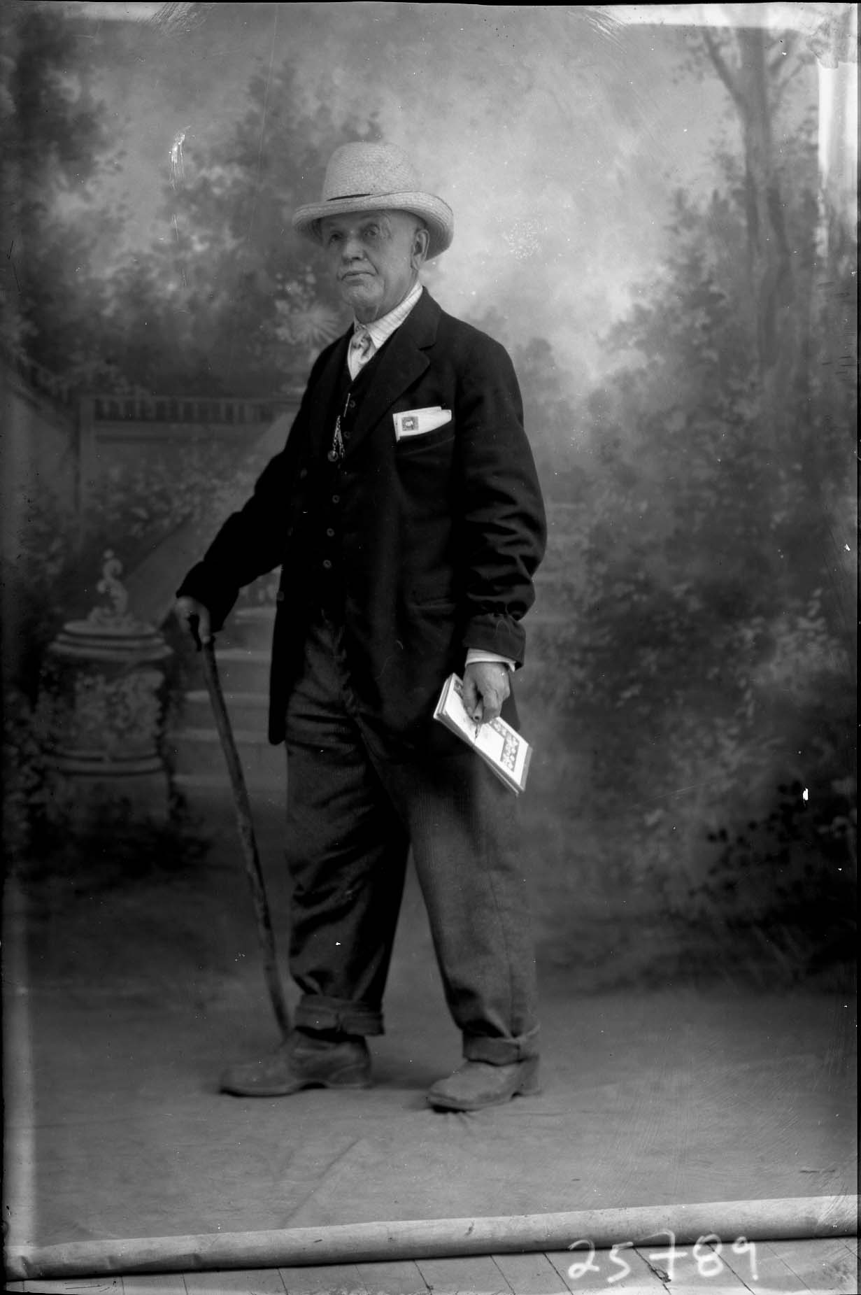 He is holding a walking stick in one hand and what appears to be a packet of papers in the other.