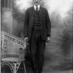 Unidentified man is standing by a wicker chair and wearing a suit and tie with a starched collar.