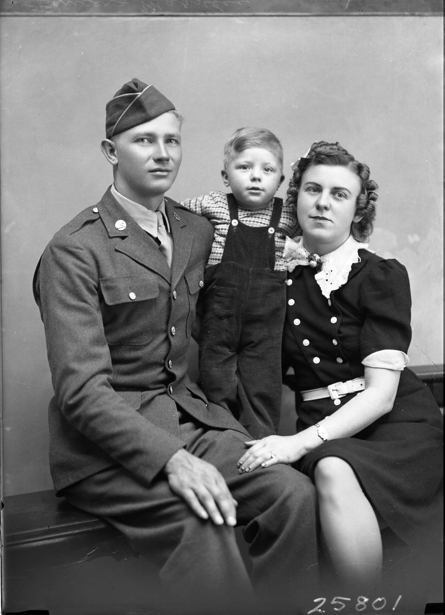 Elmer W. Markley wearing his U.S. Army uniform and seated beside his wife, Hilda (Barb) Markley and son, Jackie Markley.